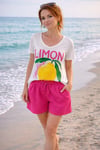 L’imprimé citron rose et jaune donne ce petit effet bonne humeur instantané. C’est le tee-shirt qui attire le regard sans en faire trop.