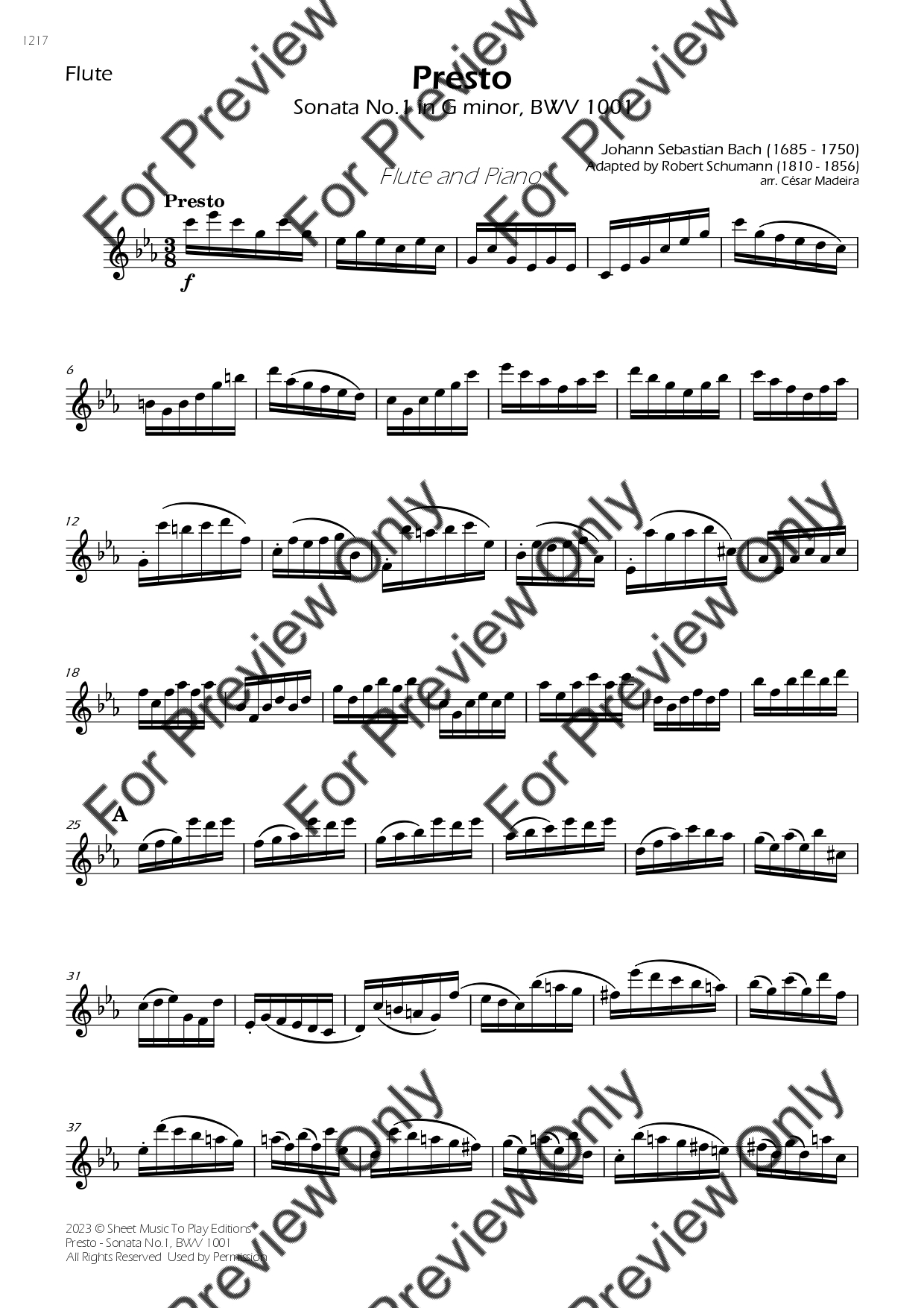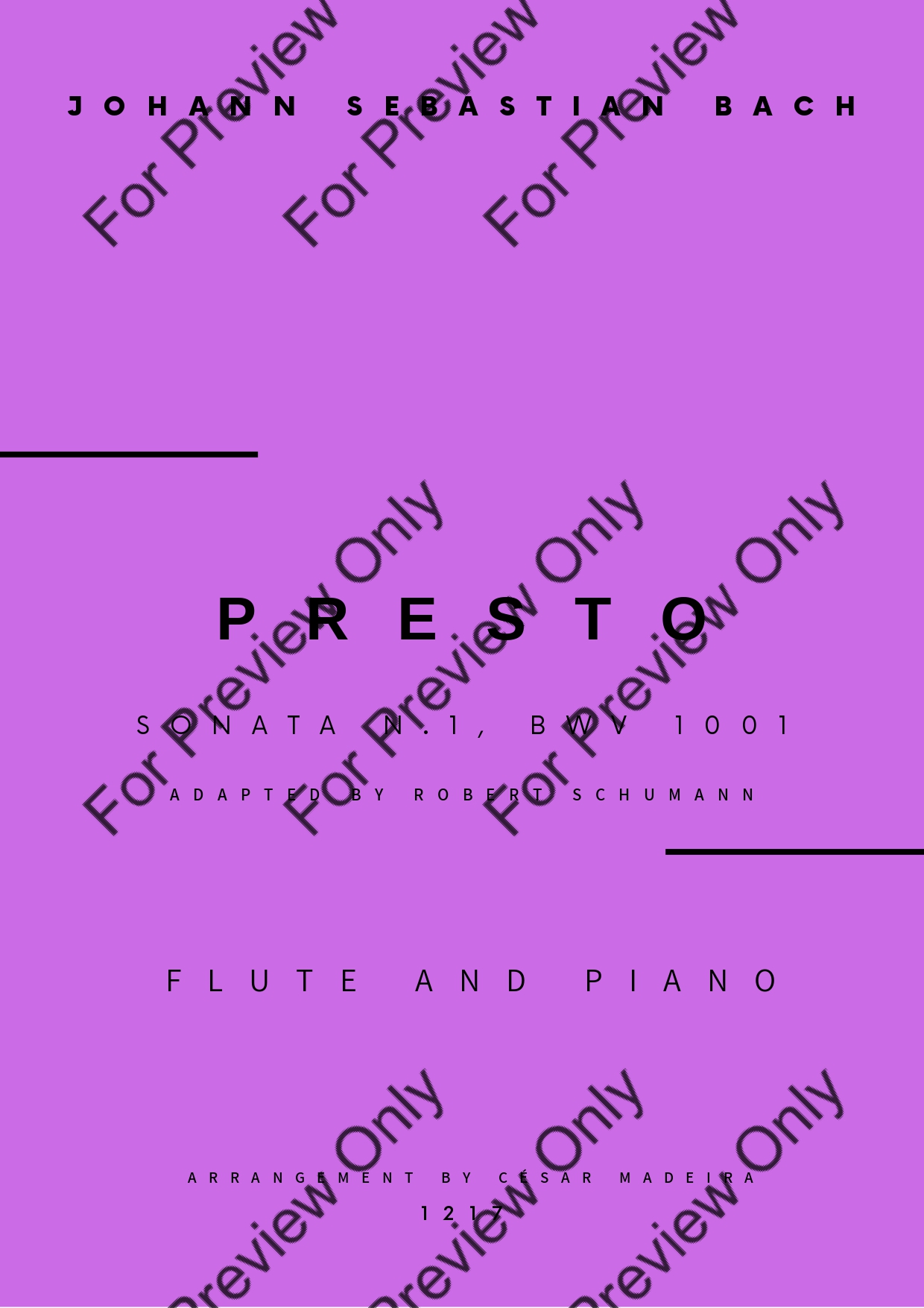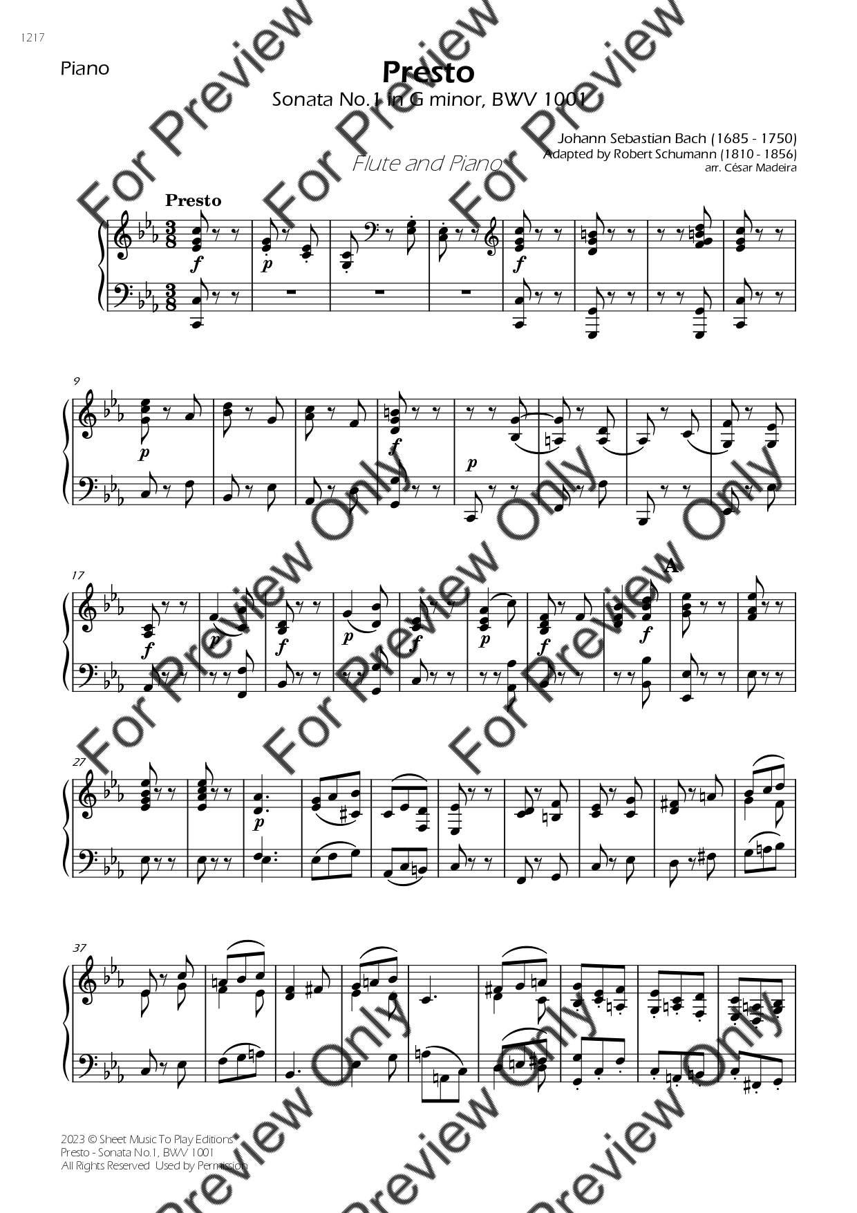 Presto from Sonata No.1, BWV 1001 by Johann Sebastian Bach. Arrangement for Flute and Piano. With Full Score and Individual Parts. Have fun!