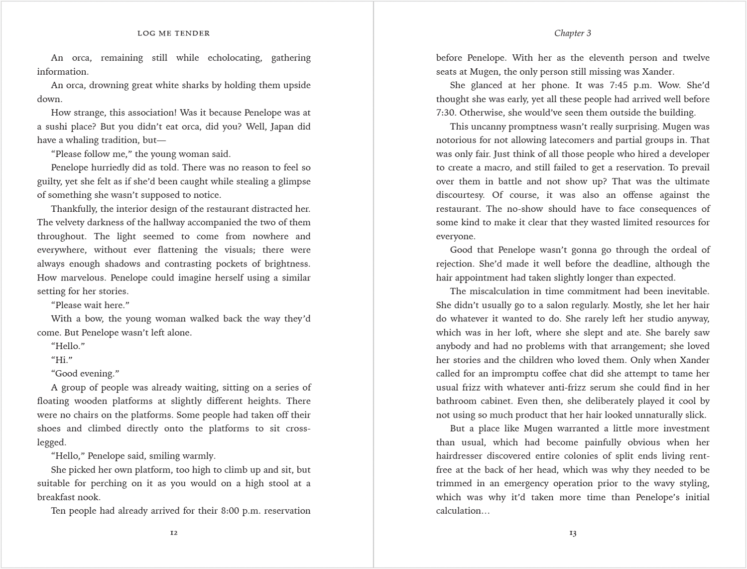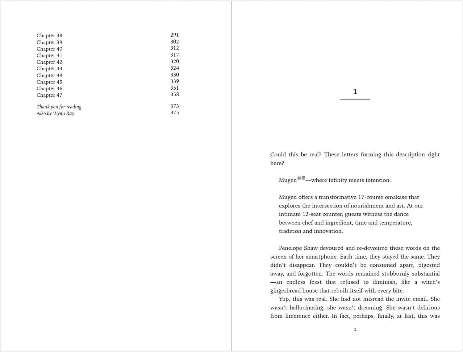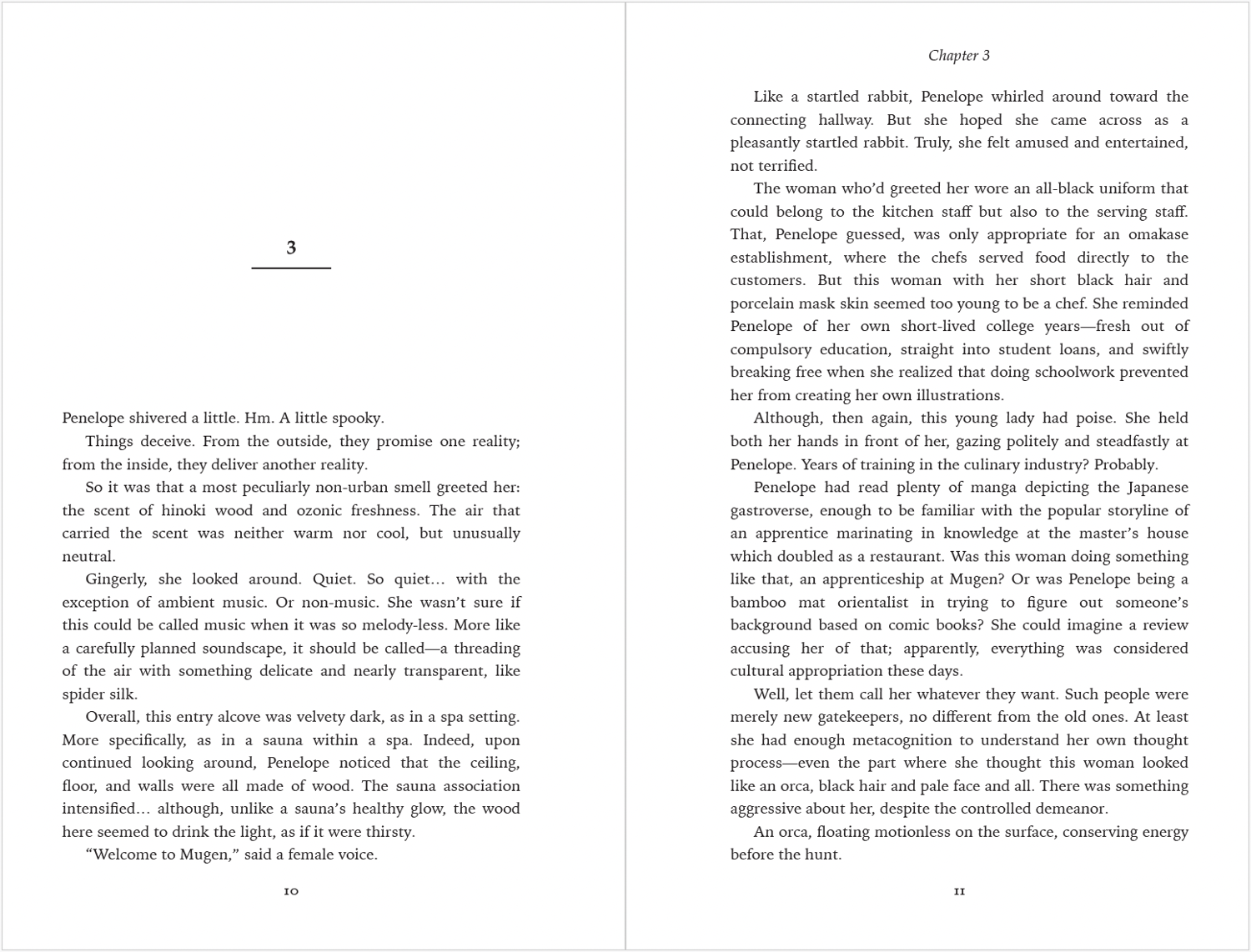 Finally! Penelope’s crush invited her to dinner at Mugen, an impossible-to-book omakase restaurant where “infinity meets intention.” She arrives expecting romance to bloom, and also to get inspired for her illustrations of culinary delights.