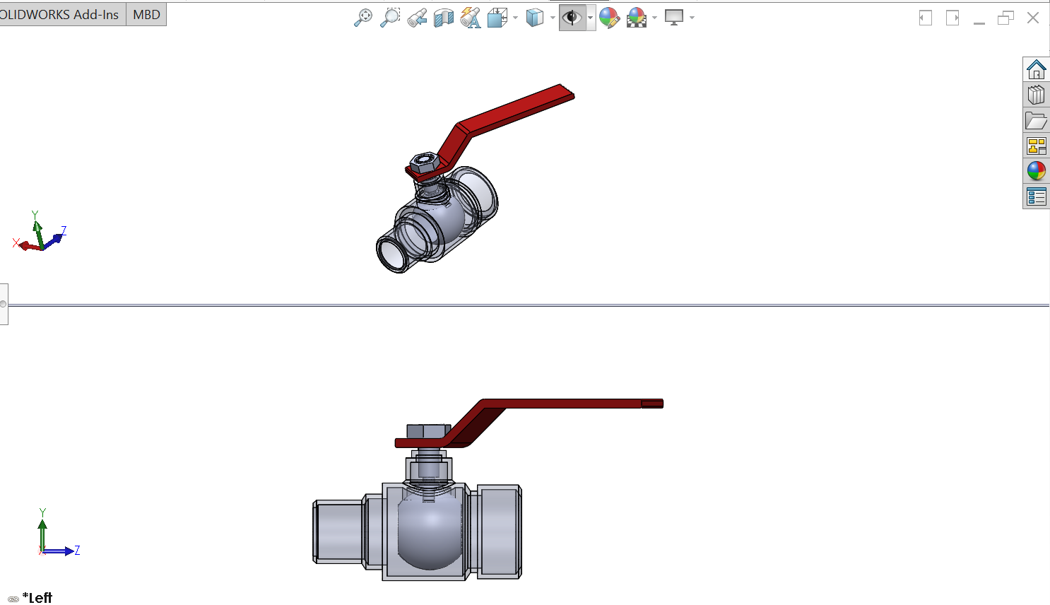 The handle lies flat in alignment with the flow when open, and is perpendicular to it when closed, making for easy visual confirmation of the valve's status. The shut position 1/4 turn could be in either a clockwise or counter-clockwise direction. Wikipedia