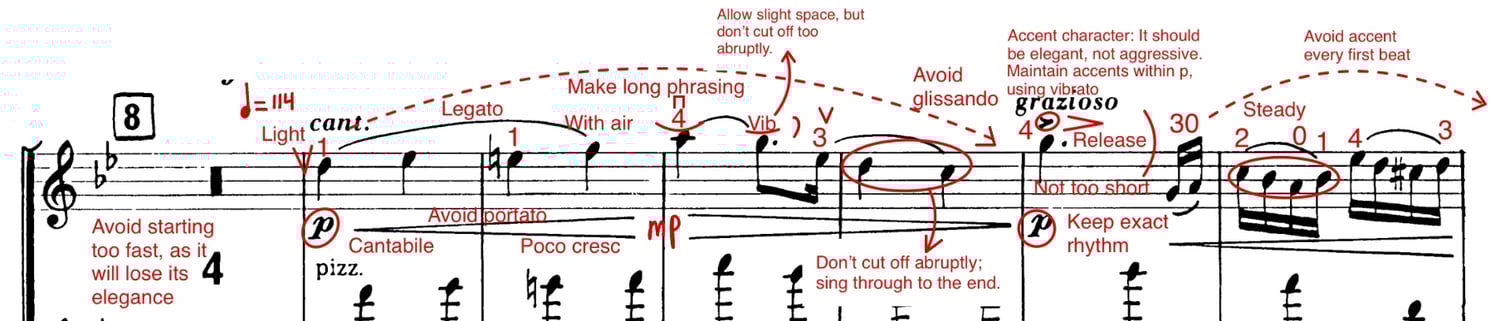 Each excerpt includes my personal bowings, fingerings, phrasing, musical ideas, audition tips, and practice strategies — refined through years of performing and auditioning with top orchestras.