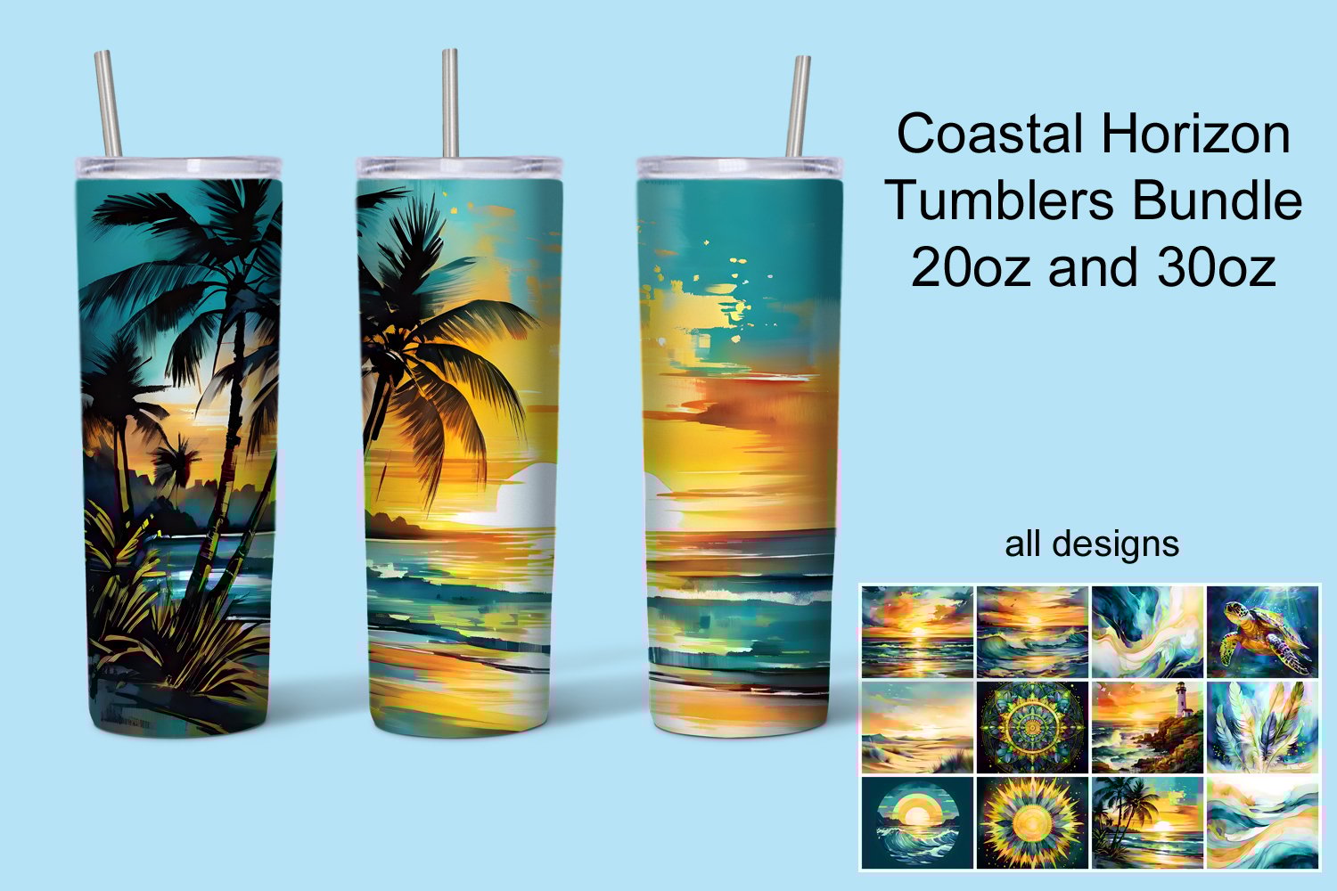 Ready to turn your hydration into a vacation? Dive into the Coastal Golden Horizon Tumbler Bundle! This collection is a love letter to the sea, featuring 12 breathtaking watercolor designs that capture the magic of a sun-drenched coast.