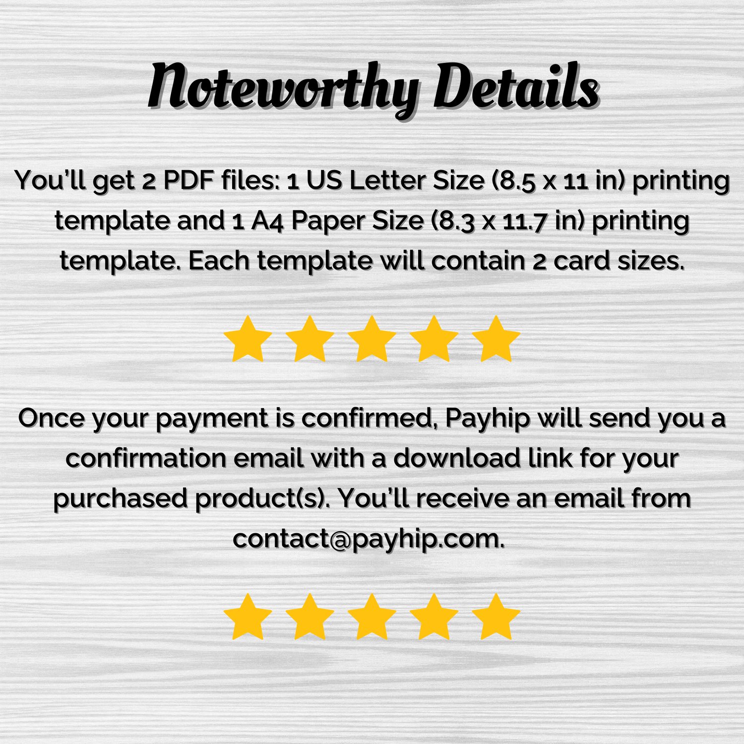 - One (1) A4 Paper Size [8.3 x 11.7-inch] PDF with printing templates for 1 card design (templates to be cut and folded into 4x6-inch & 5x7-inch cards).