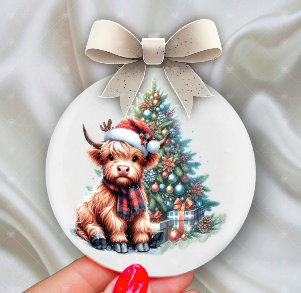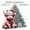 Beautiful Christmas Highland cow, watercolour with Christmas tree. For sublimation or print. PNG with transparent background