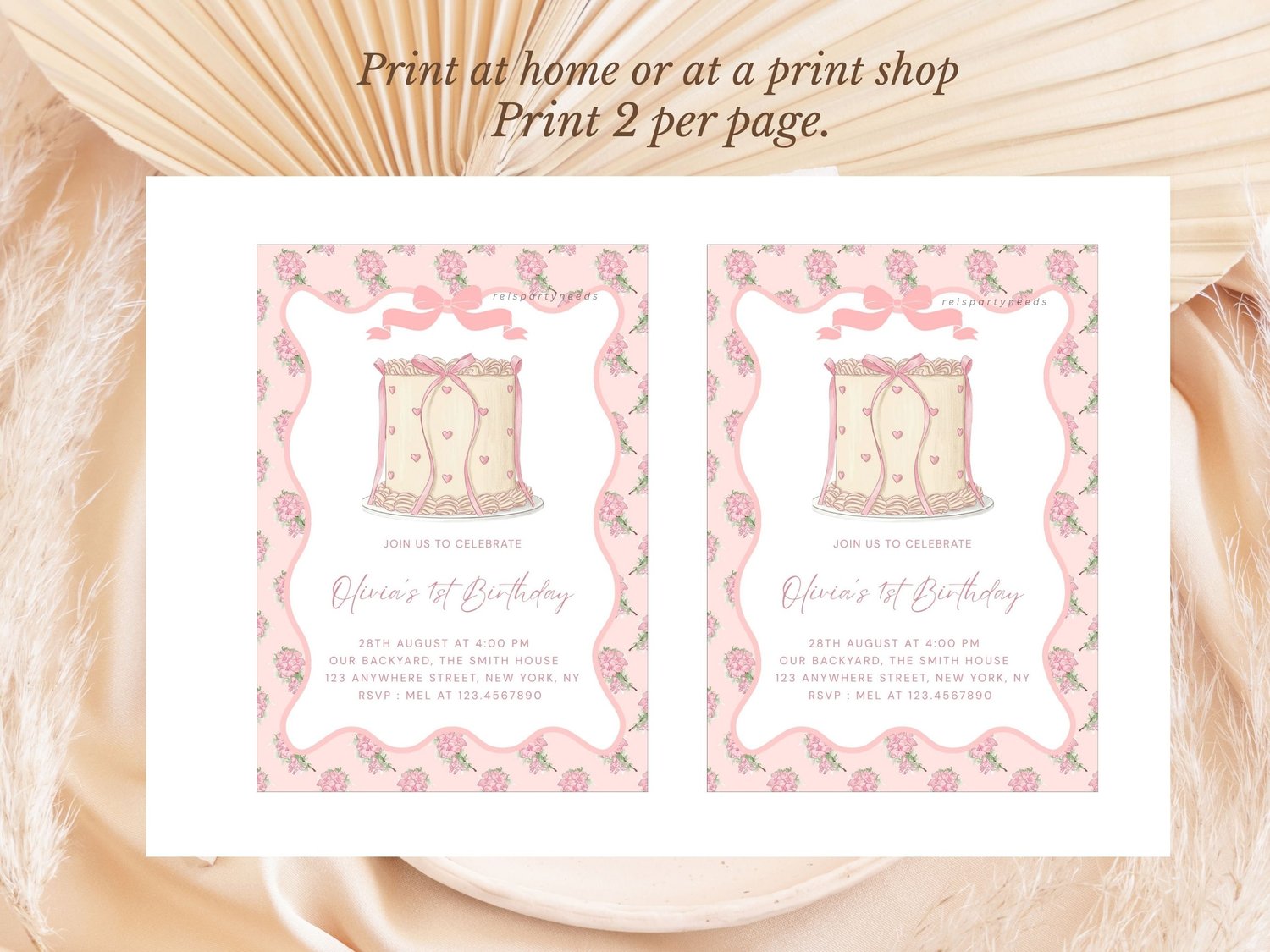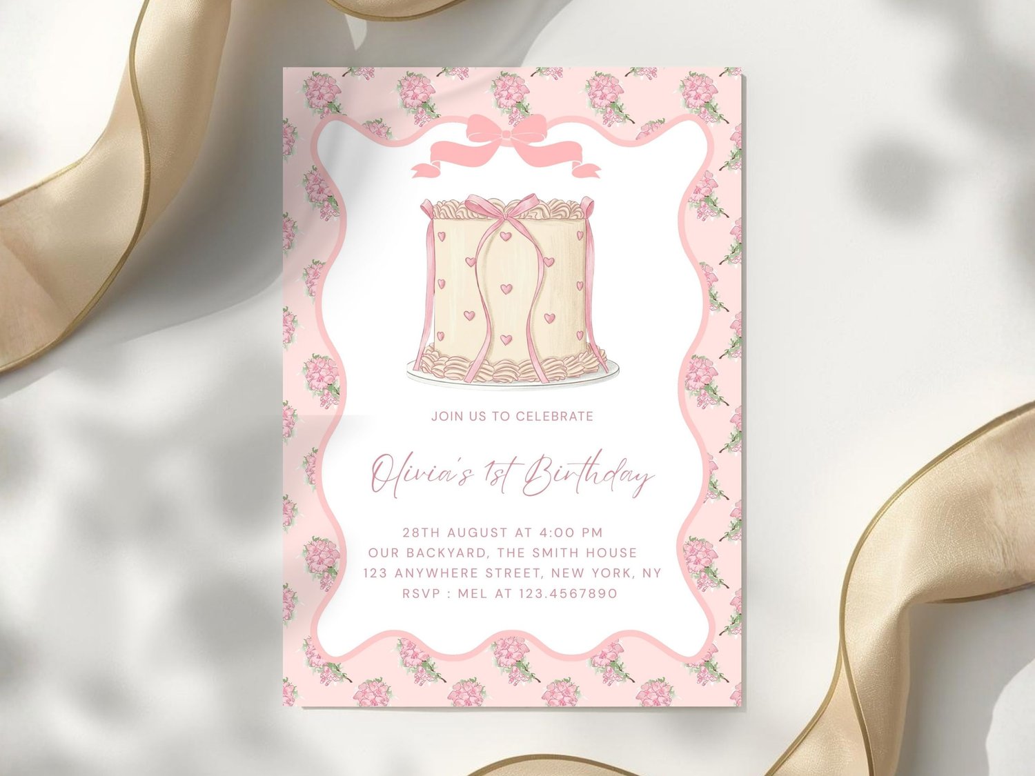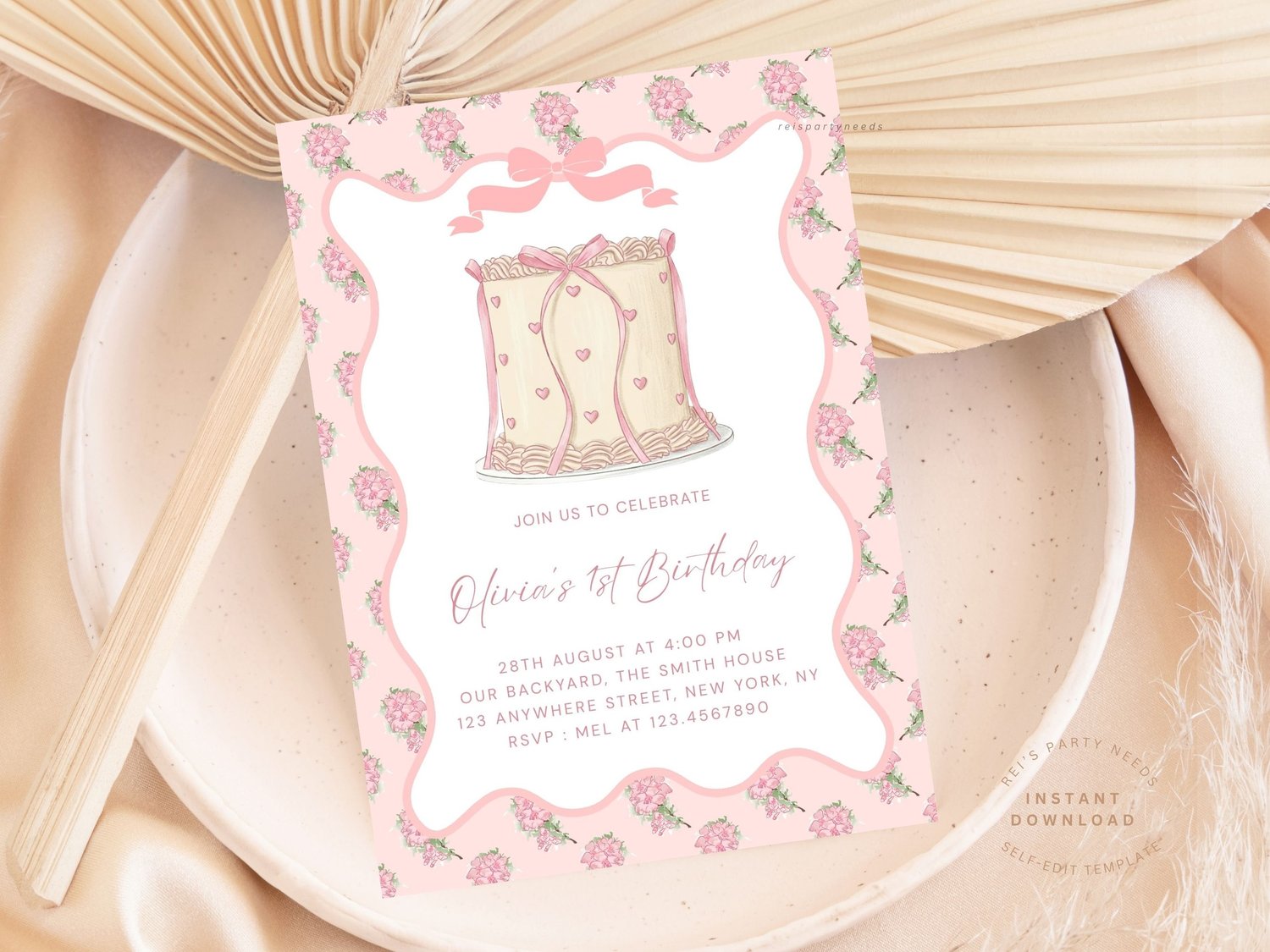 Pink Coquette Birthday Invitation Template, Vintage Cake Invite, Whimsical Floral Girl Birthday Party Invitation, Editable Canva Invite