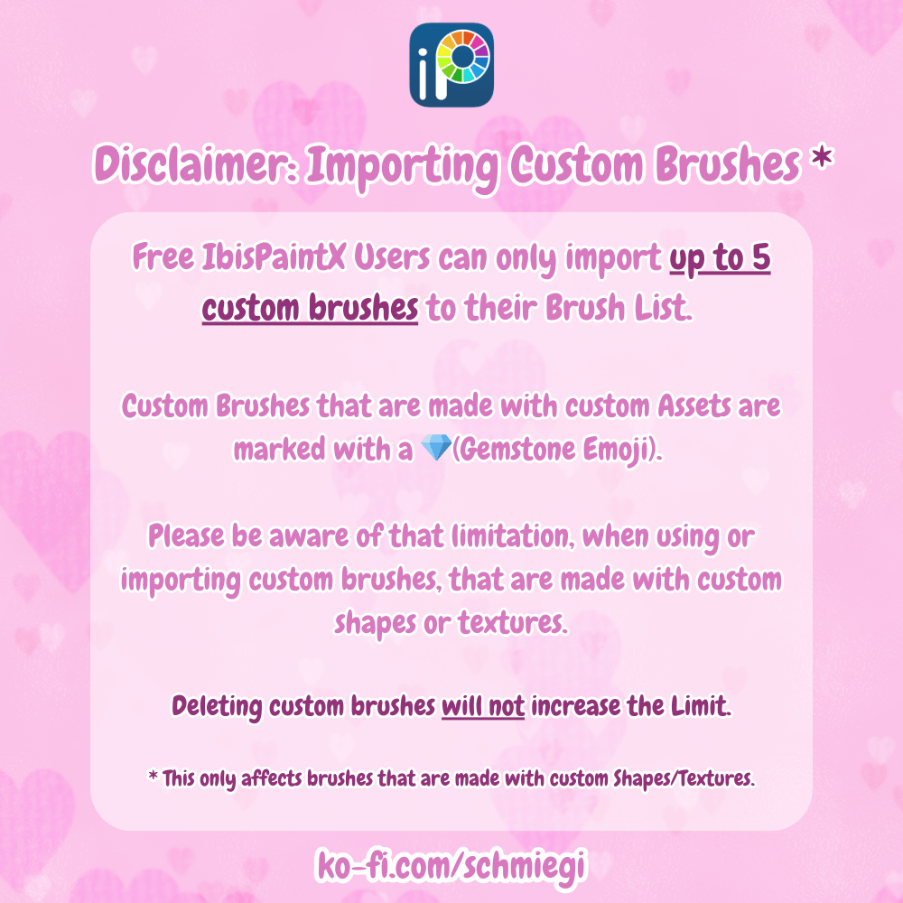 Brushes that are made with custom Assets are marked with a 💎Gemstone Emoji. Please be aware, that the Free App can only import up to 5 custom brushes!! All brushes that are made with Assets from the App itself (no custom assets), will be still working without reaching the limit of the custom imports.