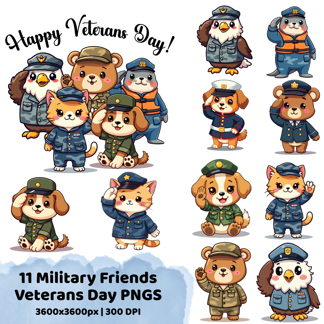 Celebrate Veterans Day with this Kawaii Military Friends Clipart Bundle. This set includes 11 high-quality PNGs (3600x3600px, 300 DPI, transparent backgrounds) featuring cute patriotic animals in military-inspired outfits — perfect for creating heartfelt projects that honor our veterans.