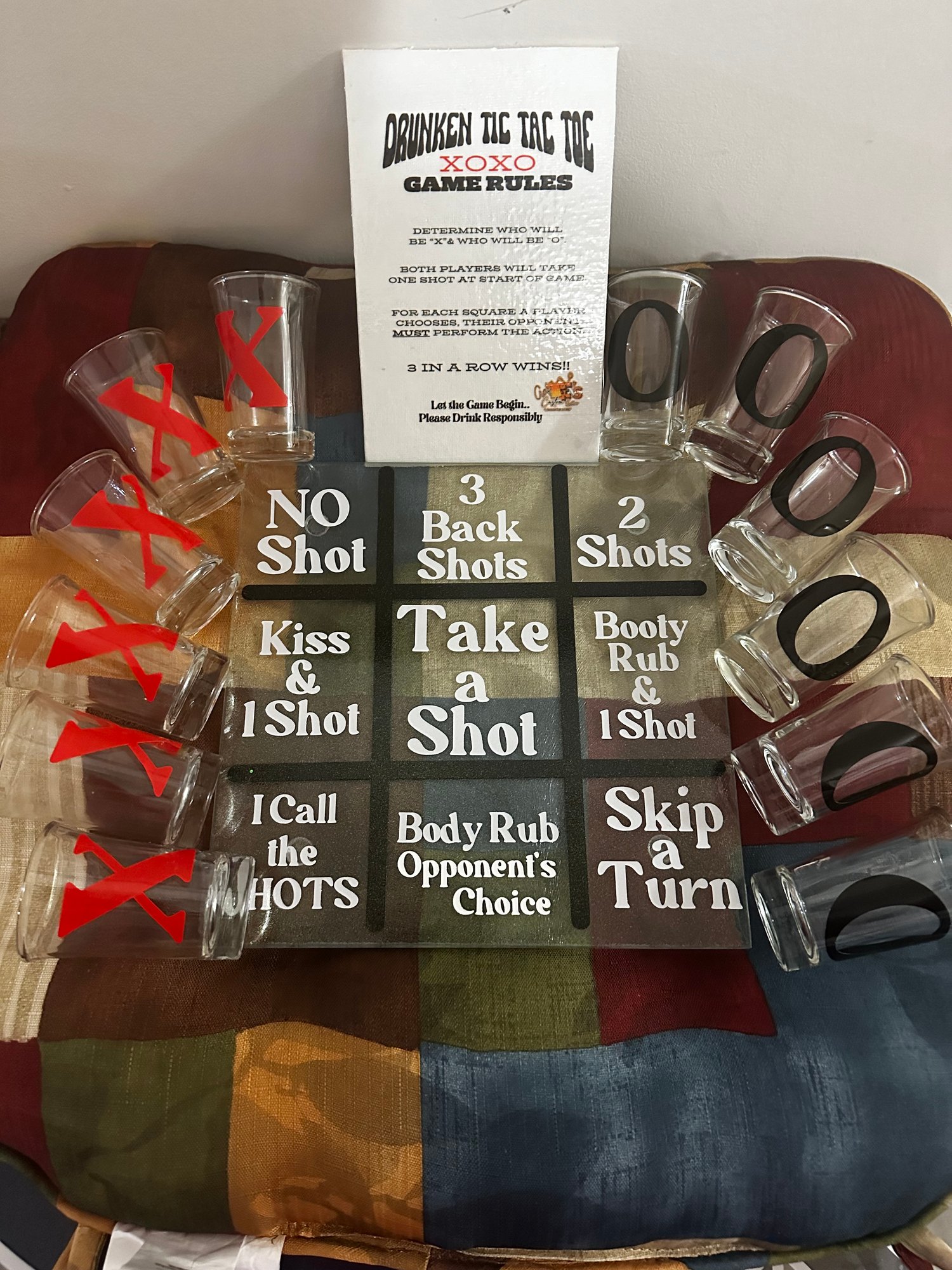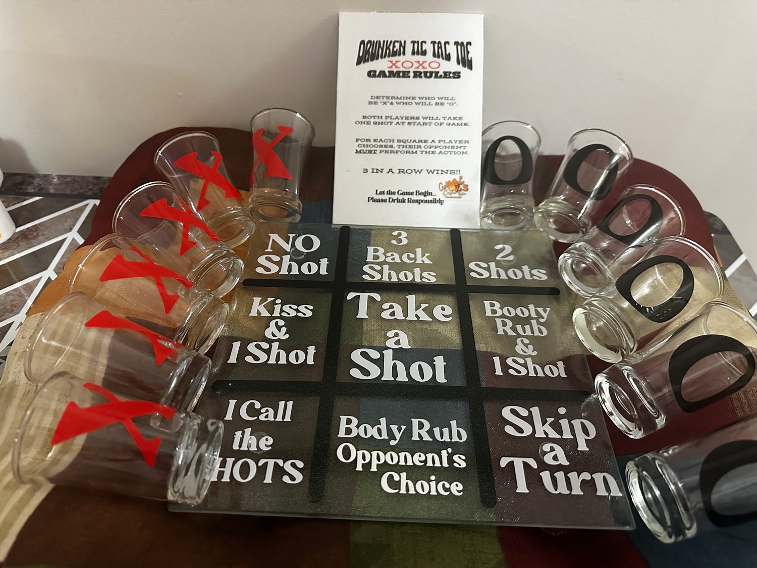 Get ready for a fun twist on a classic game with "Drunken Tik Tok Toe"! This unique, custom-designed game combines the nostalgic fun of Tic-Tac-Toe with a spirited drinking game, perfect for parties, gatherings, or any occasion that calls for laughter and friendly competition.