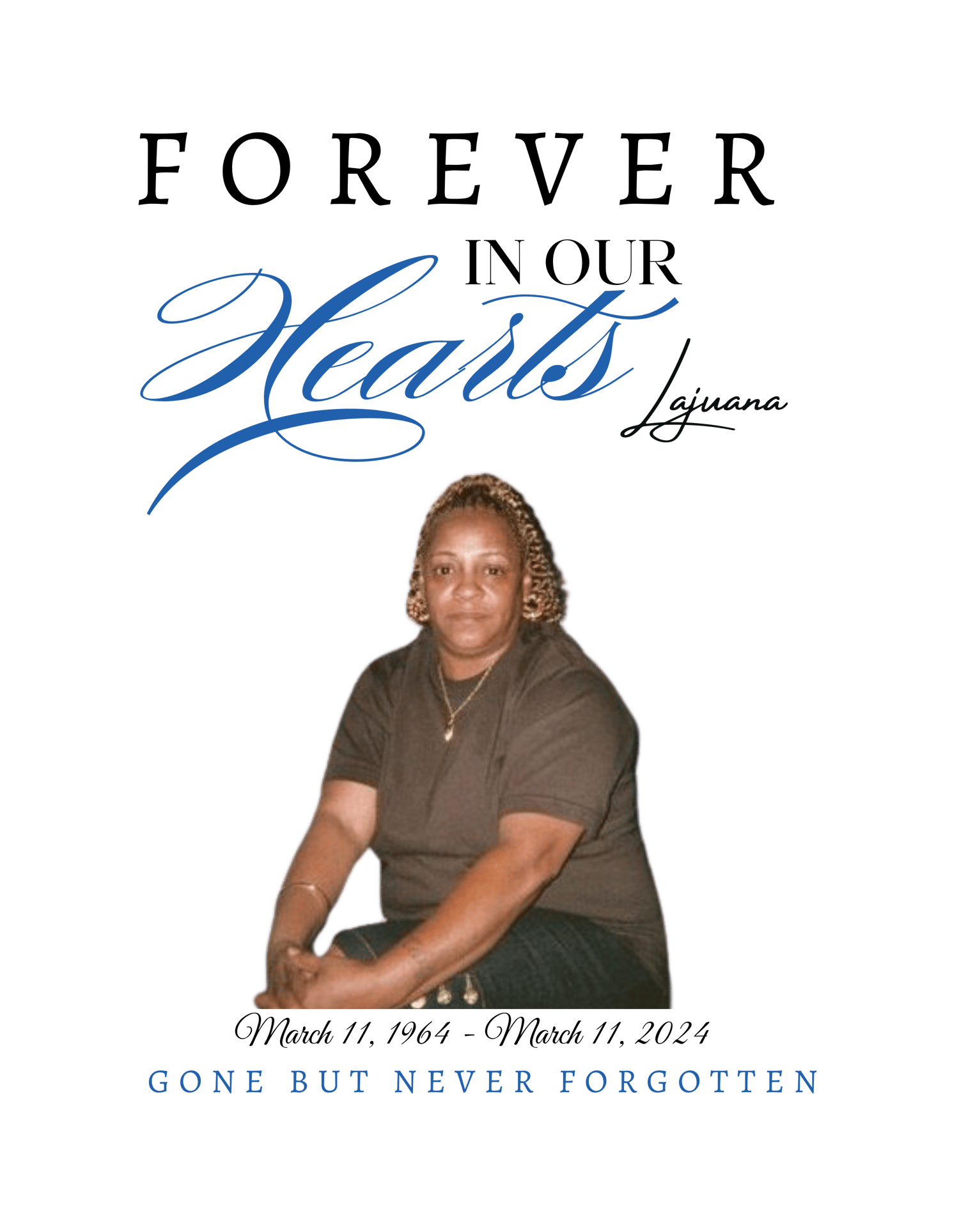 Create a lasting tribute with this editable memorial template — designed for T-shirts, sweatshirts, and more. This Forever In Our Hearts design is fully customizable, allowing you to add your loved one’s photo, name, and dates with ease. Perfect for funeral services, anniversaries, and remembrance events, this template helps families honor their loved ones with a beautiful keepsake.