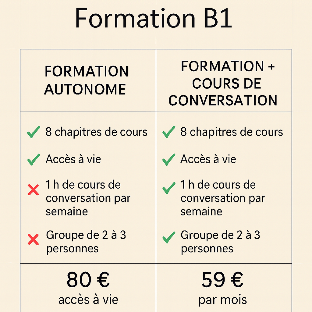 Les cours de conversation commencent à partir de 2 inscrits. S’il n’y a pas assez de participants, vous serez remboursé ou redirigé vers la formule autonome. Je peux aussi vous proposer 2 séances individuelles de 30 min par mois.