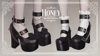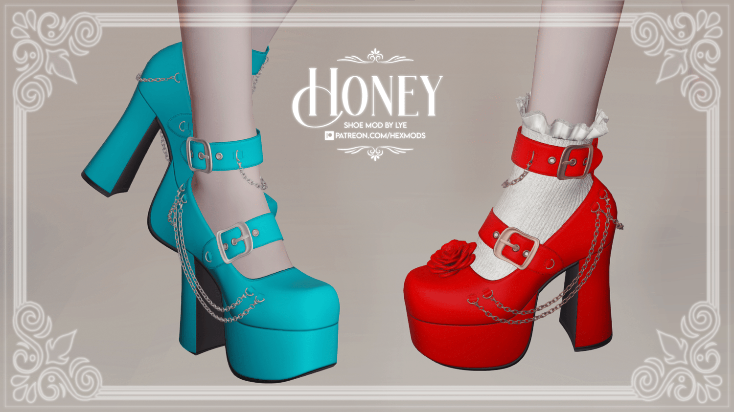 Platform heels with chains and a decorative rose at the front.