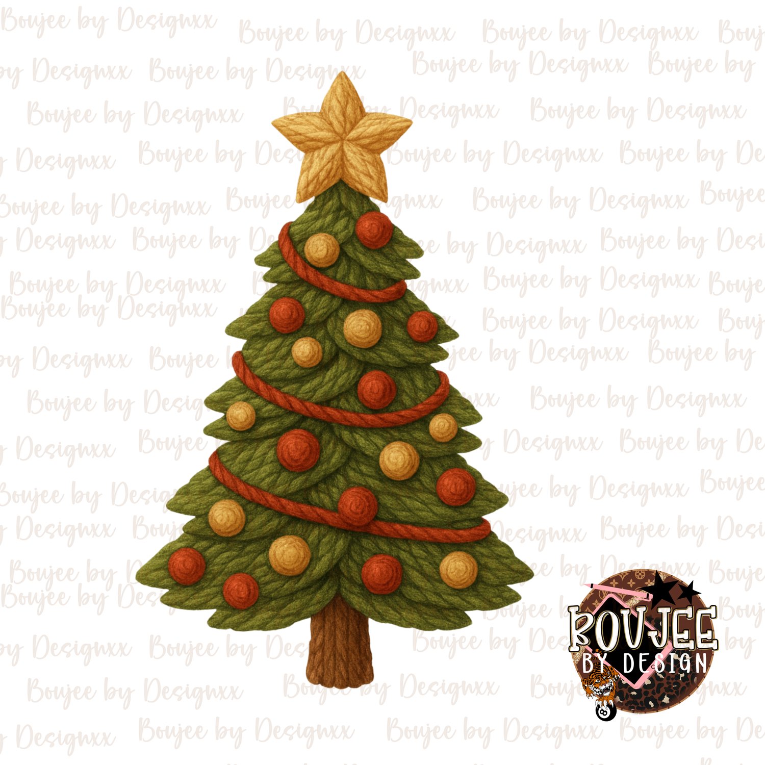 Bring cozy handmade charm to your holiday designs with this yarn-textured Christmas tree PNG — perfectly matching the “Boujee by Designxx” cozy yarn Santa collection! This unique artwork features a soft rope-like texture with warm green tones, a golden star, and red-gold ornaments, ideal for adding a handmade touch to your Christmas creations.