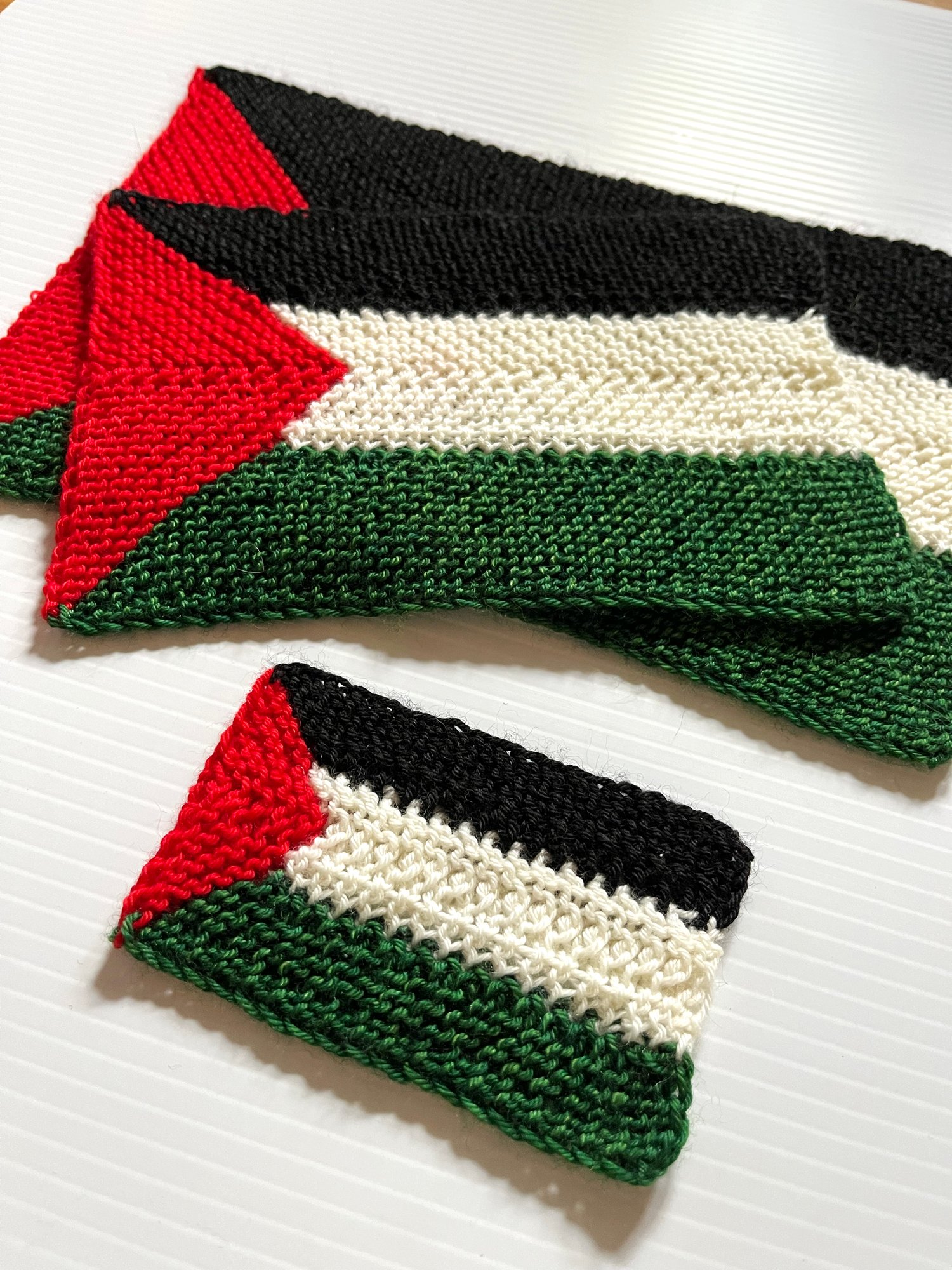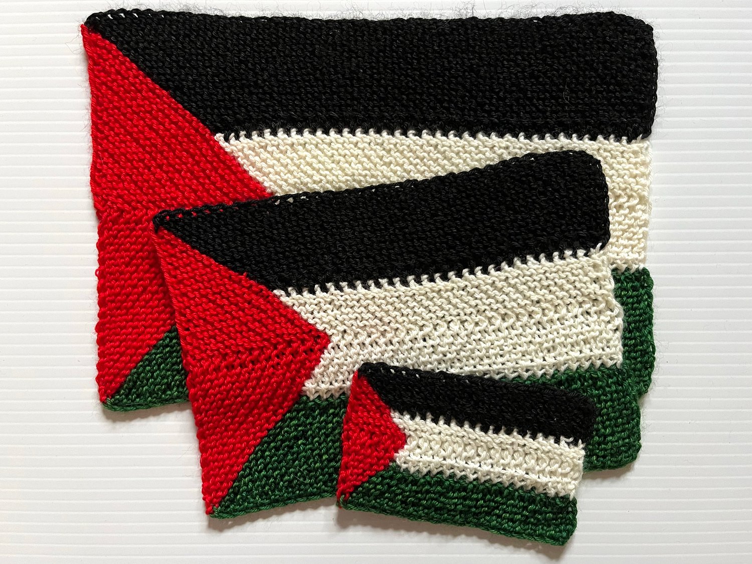 This modular Palestinian Flag is best for intermediate knitters, or adventurous beginners who are feeling up to it! Everything is shaped with increases and decreases, and joined by picking up selvage stitches as you work sideways. This way there’s no intarsia or seaming!