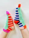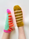 (Please note that single color cuffs and toes are knit in the round, but the rest of the sock is knit flat. The halfsies cuffs and toes are worked flat. I am working on an update that includes how to knit the entire sock flat if you prefer single color cuffs and toes. Until that is available, if you've purchased the pattern, instructions for working the socks entirely flat with single color cuffs and toes are available upon request.)