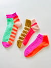 Because these socks are so customizable, exact yardage will depend on the yarn you use, your gauge, foot length, leg length, and any modifications or customizations that you make. Each pair of kids socks will require 75-250 yds/69-229 m of fingering weight yarn. Each pair of adult socks will require 145-400 yds/133-366 m of fingering weight yarn. Each section of each sock uses very little yardage, so these socks are perfect for mini skeins and using up leftover yarns!