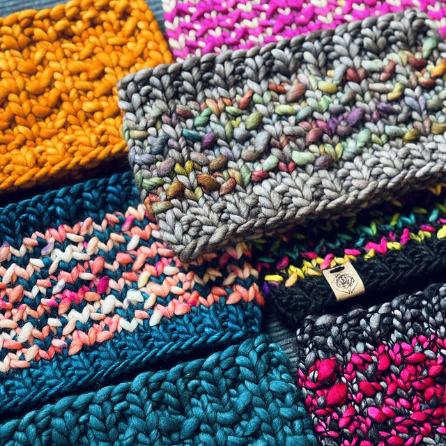 The Cleeve Earwarmer is written for 2 weights of yarn, super bulky and light super bulky as well as with the option of using one or two colors. It uses such a small amount of yarn, it is the perfect stash buster. And it takes less than an hour to knit! WIN WIN!