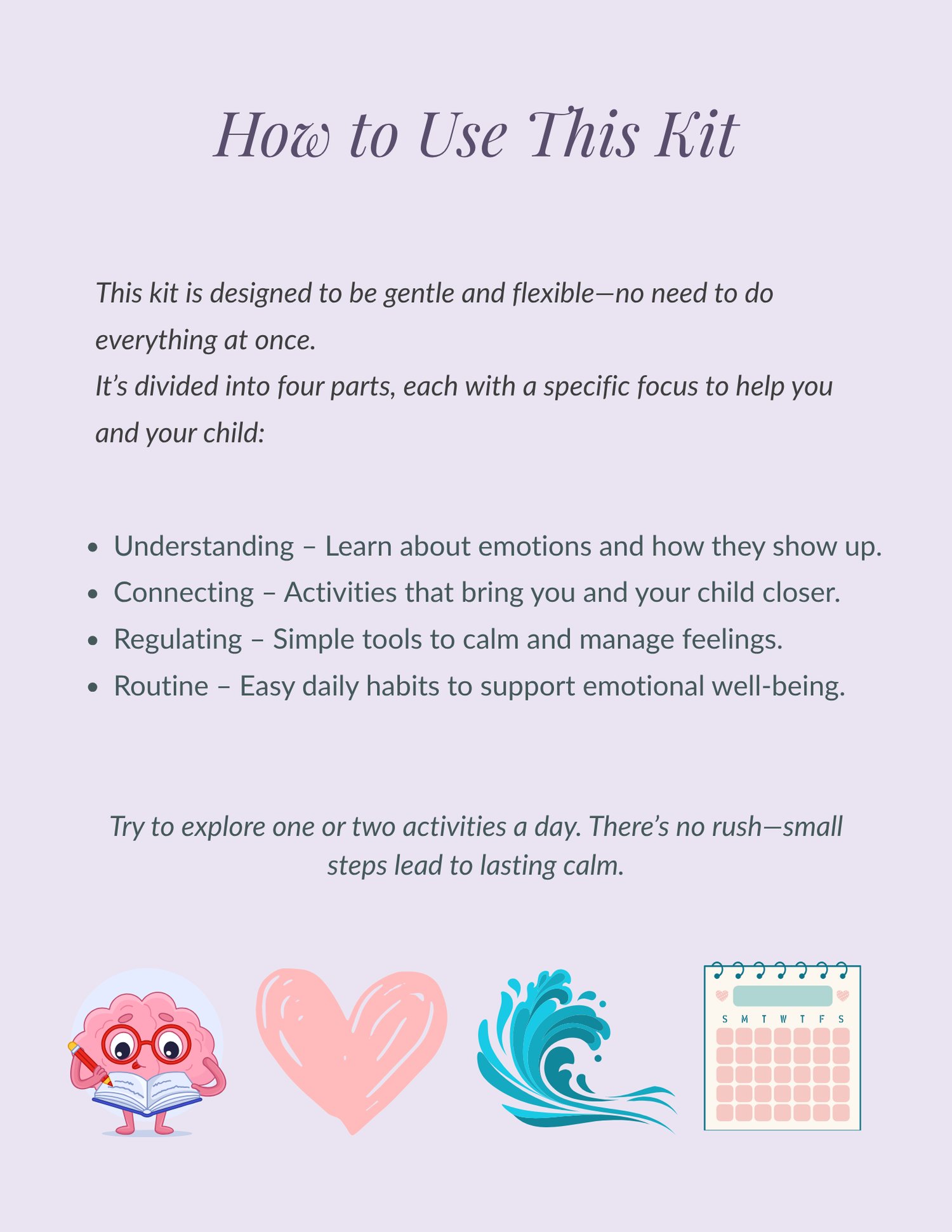 How It Works: Download the kit, print it out or use it on your device, and start your journey through emotions and creativity alongside your child. Each page guides you step by step toward calmer, more connected days.