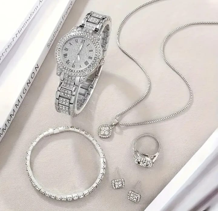 A trendy, fashionable watch with a cosmetic jewellery set.