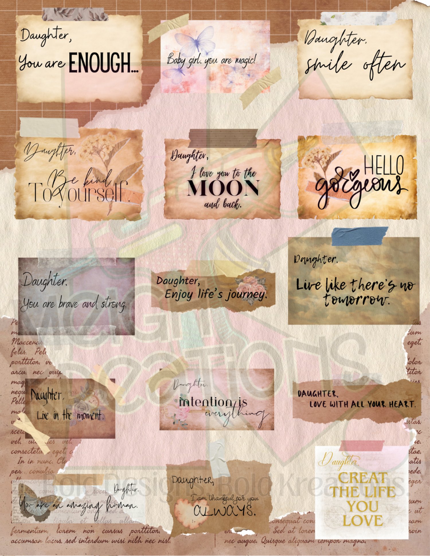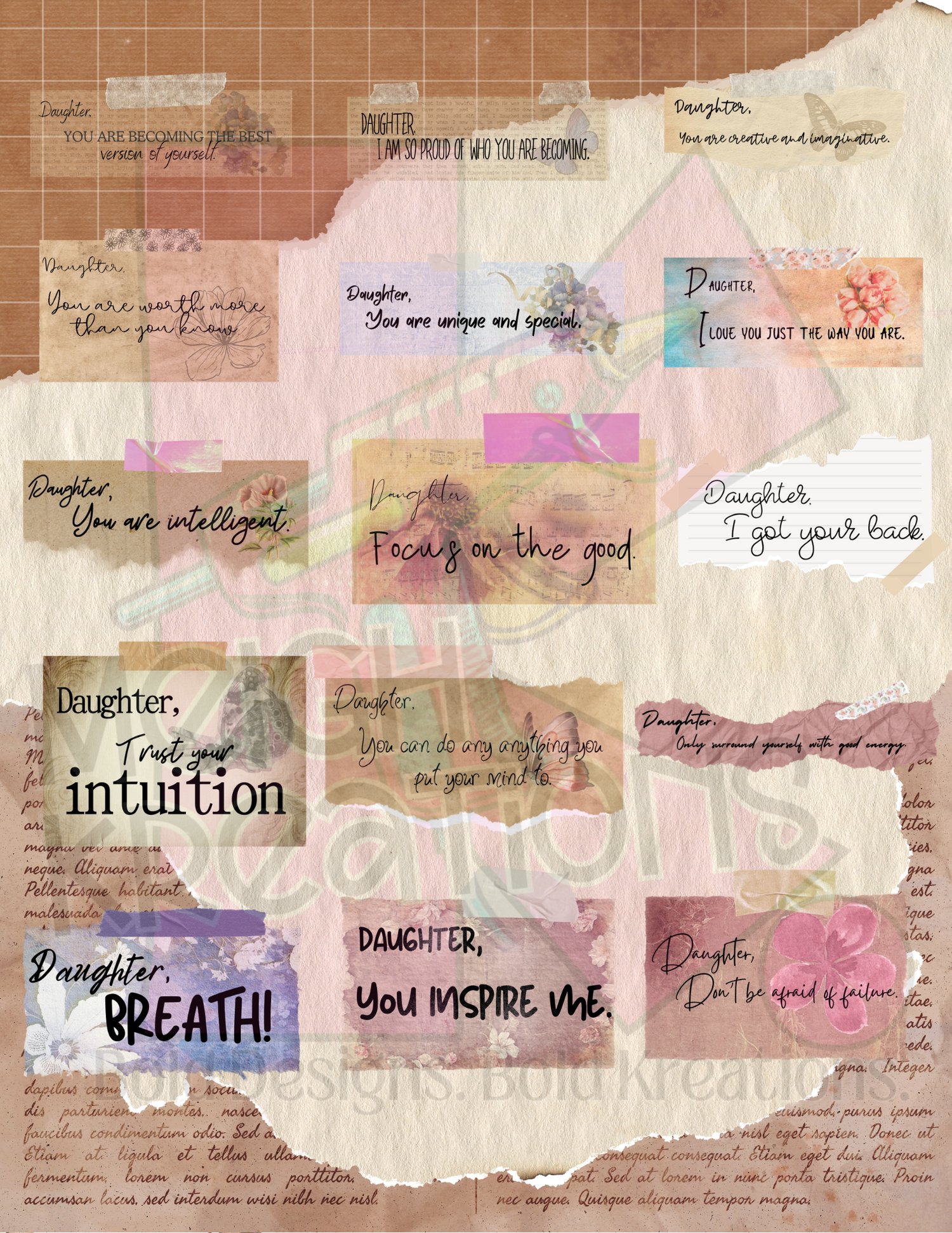 Encourage, uplift, and inspire with this Sitting Pretty: 42 Dear Daughter Affirmation Notes Clipart Pack. Designed in a warm vintage mixed-media aesthetic, this collection of affirmations is perfect for creating meaningful projects that celebrate love, trust, and confidence.