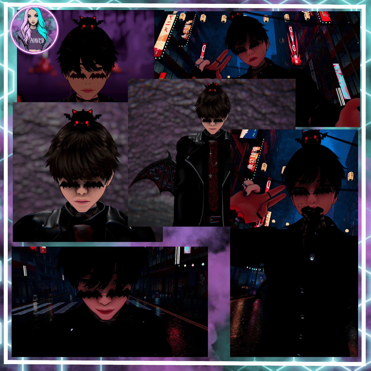 Head (edited by Me) > Sivka - Body > Aki Base by Akira ( Akii#9999) - oIillowArt - Hair 1 - Kenji > Saikura Hair 2 - Zeneris > Saikura - Suit tops and Pants by PillowArt - Fishnets by PillowArt - Pumpkins by FBT Haven - Bat Glasses by Sockembopem - Vampire wings by Deimos - Biker Boots by Sezzy - Bat Plushie by Moonlit Peach - Belted Hoodie by Sukii - Performance icons by Zinpia - Blood Matcap by Sivka - Matcaps by Jvliette - Free cici hair texture edits By Saikura - Cici free hair Textures originals by CicieaaaVR - Coffin AFk animation by KisuPixelTopia - Hair Matcap By Que - Poiyomi Toon Shader - Pink - Blue - Menu Icons by Maddiee - Skin Normal map by Ask Amber