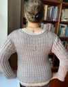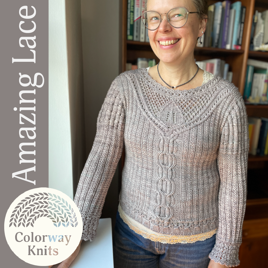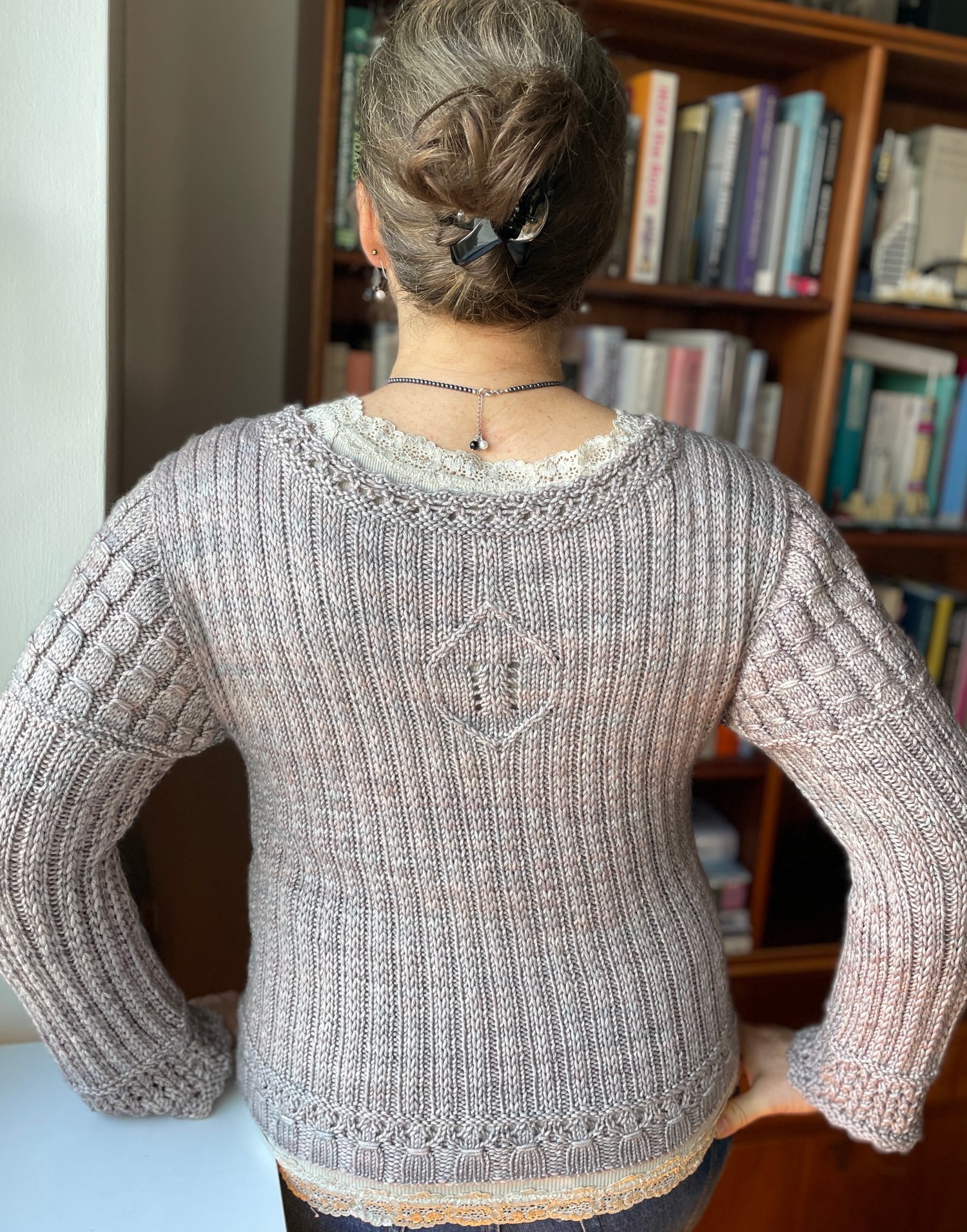 This sweater is worked bottom-up in the round, starting with some lacy details and then working upwards with a cable at centre front. Where the start of the sleeves will be, sts are bound off and the front lace V design is worked flat, as well as the back counterpart. Shoulders are sewn together slightly towards the front before stitches are picked up for the neckline which is worked in the round. Sleeve stitches are picked up and the top sleeve is shaped by using German short rows. Some details are added along “sleeve island” to make it more interesting.