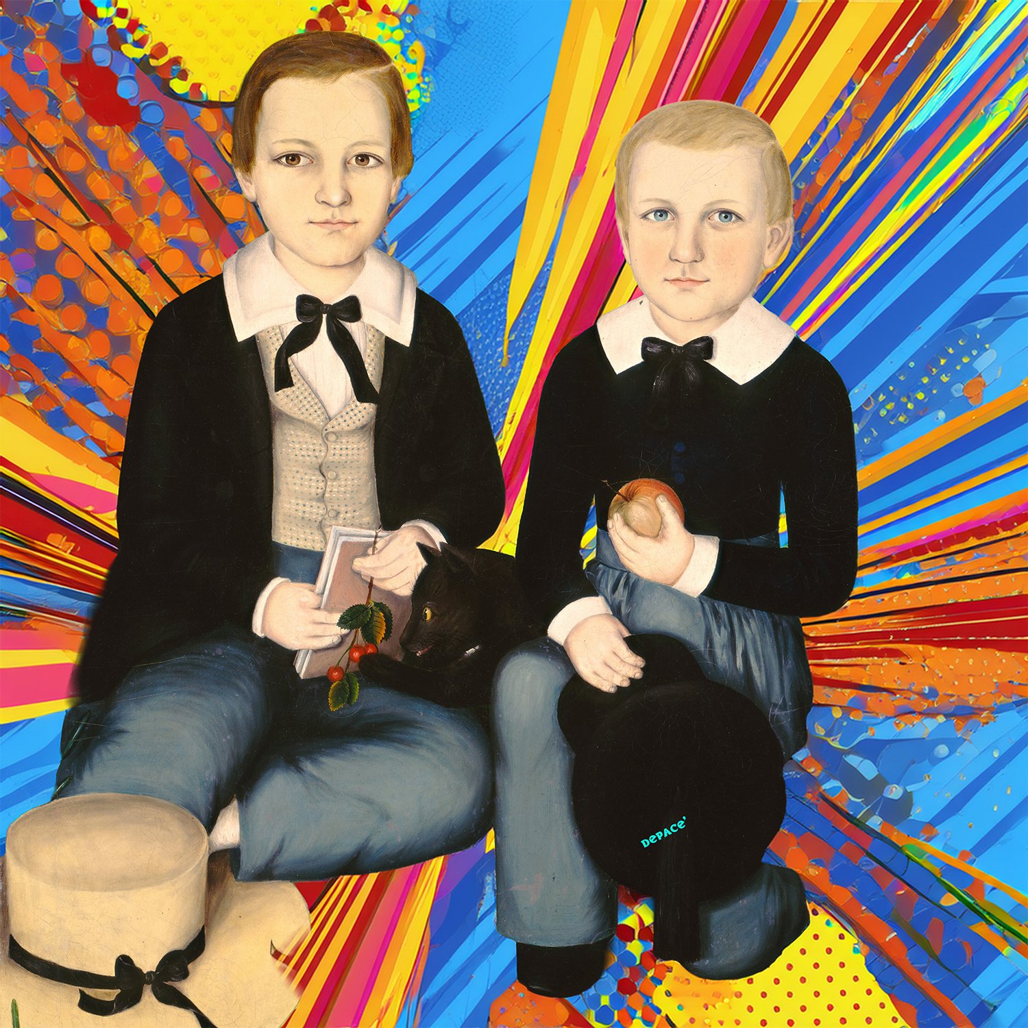Two solemn brothers from 1845 sit side by side, their antique charm strikingly framed by a vivid pop art background — a meeting of centuries where vintage portraiture collides with bold, modern expression.
