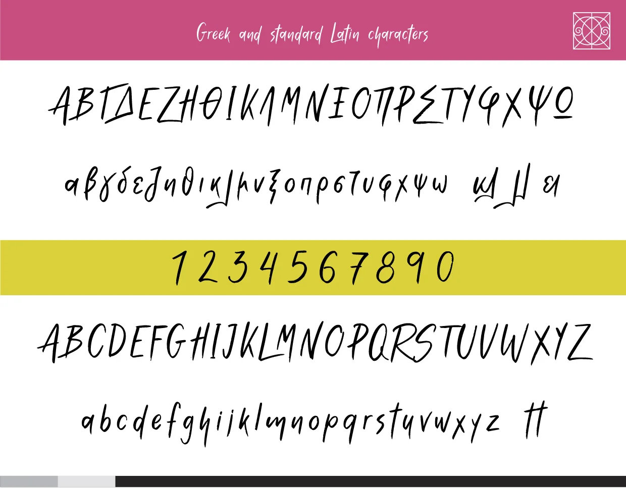 KD Keabrush supports Greek and Latin standard character set. It contains a complete set of lower and uppercase letters, punctuation and numbers.