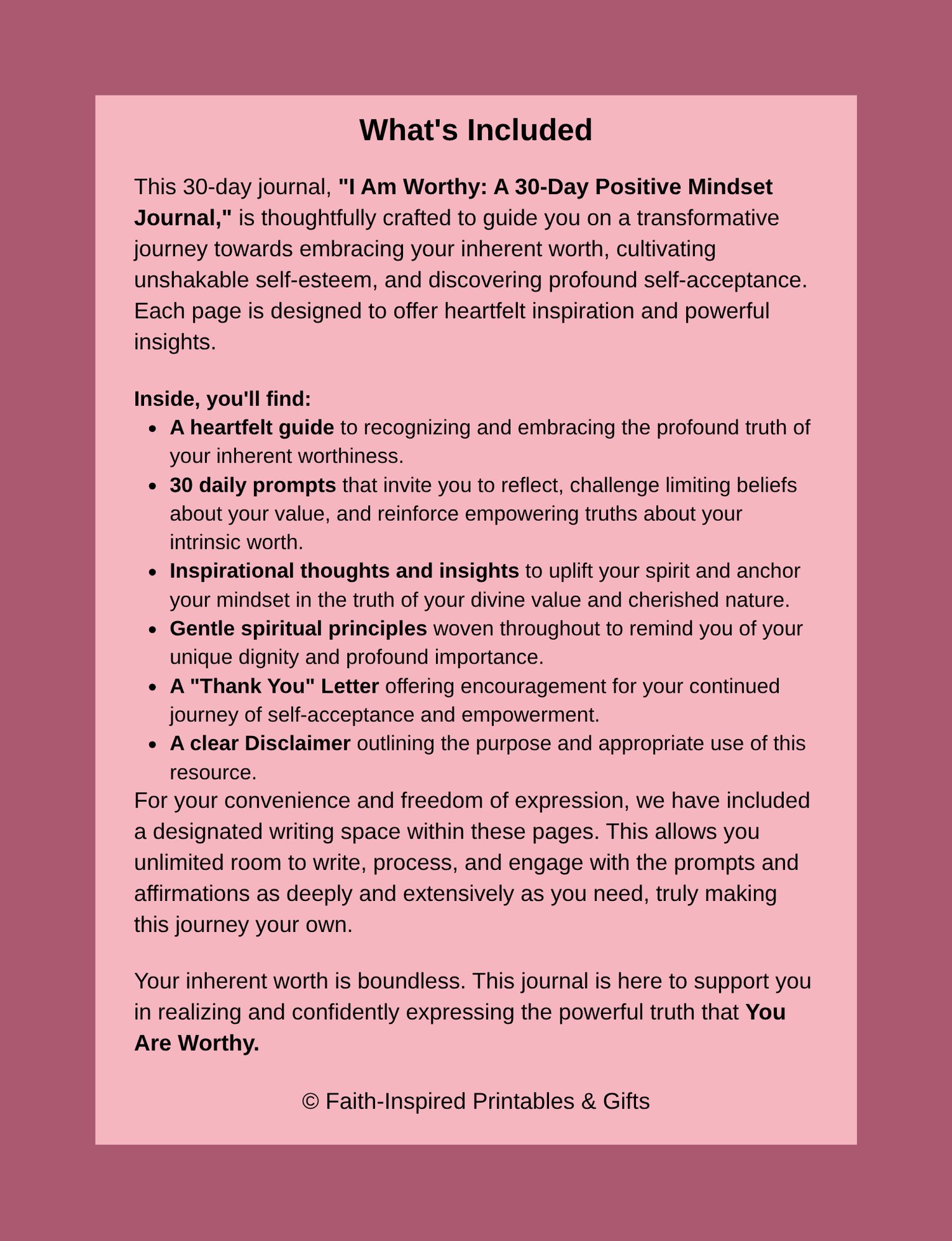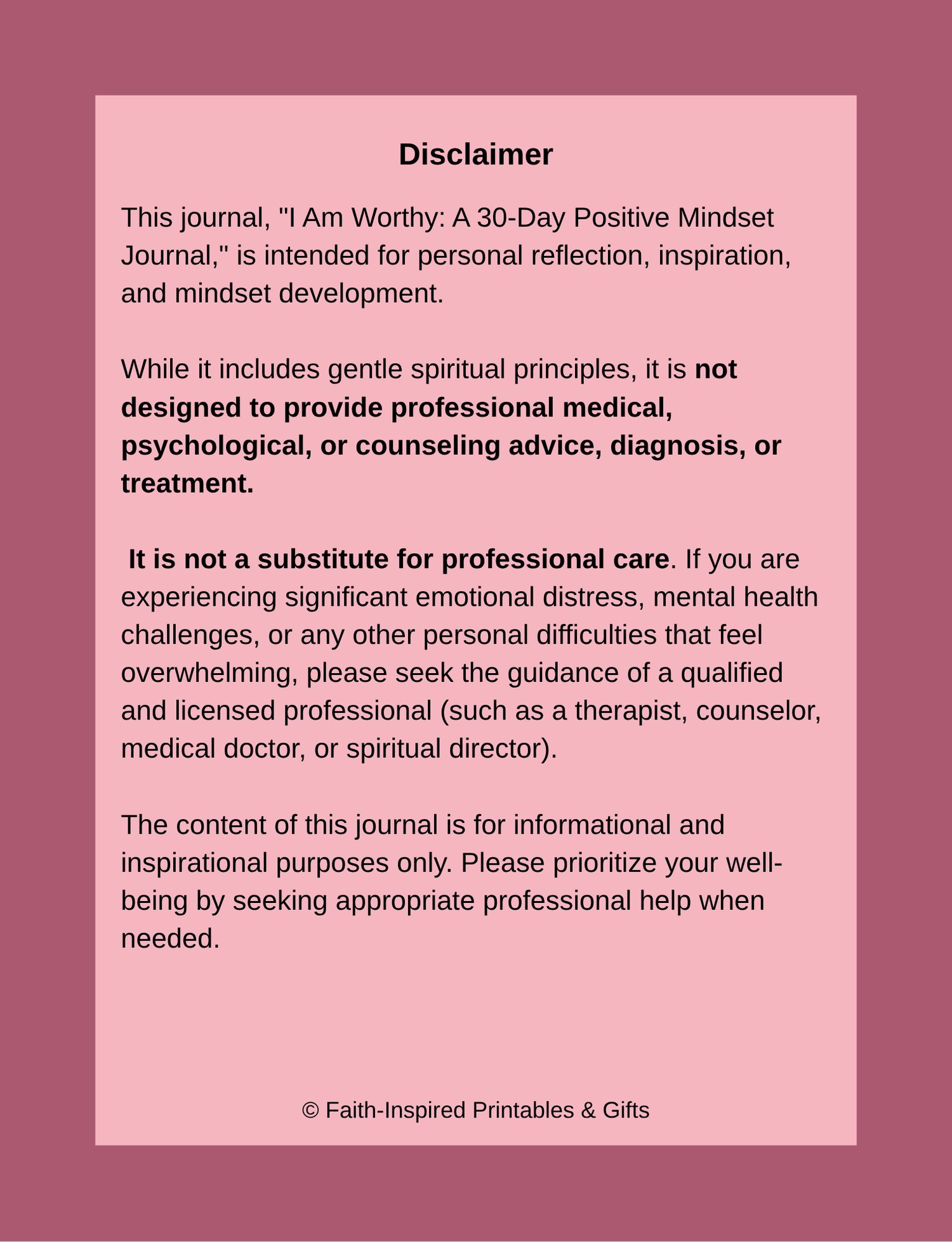 The "I Am Worthy: A 30-Day Positive Mindset Journal" is intended for personal reflection, encouragement, and mindset support. While it includes uplifting spiritual principles, it is not intended to replace professional medical, psychological, or counseling advice, diagnosis, or treatment.