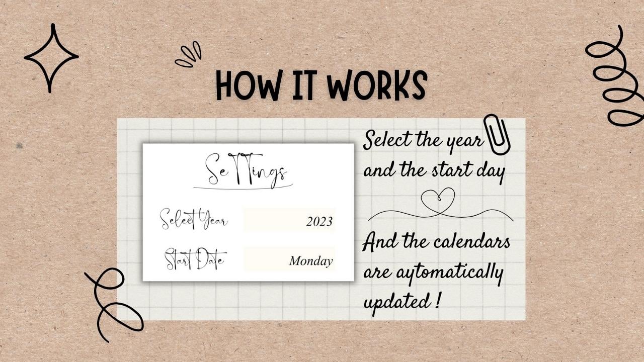 You will get an Excel file with 14 tabs.First tab: Settings. In which you can tape the year of your choice and select the start day of the week (sunday, monday, etc).