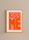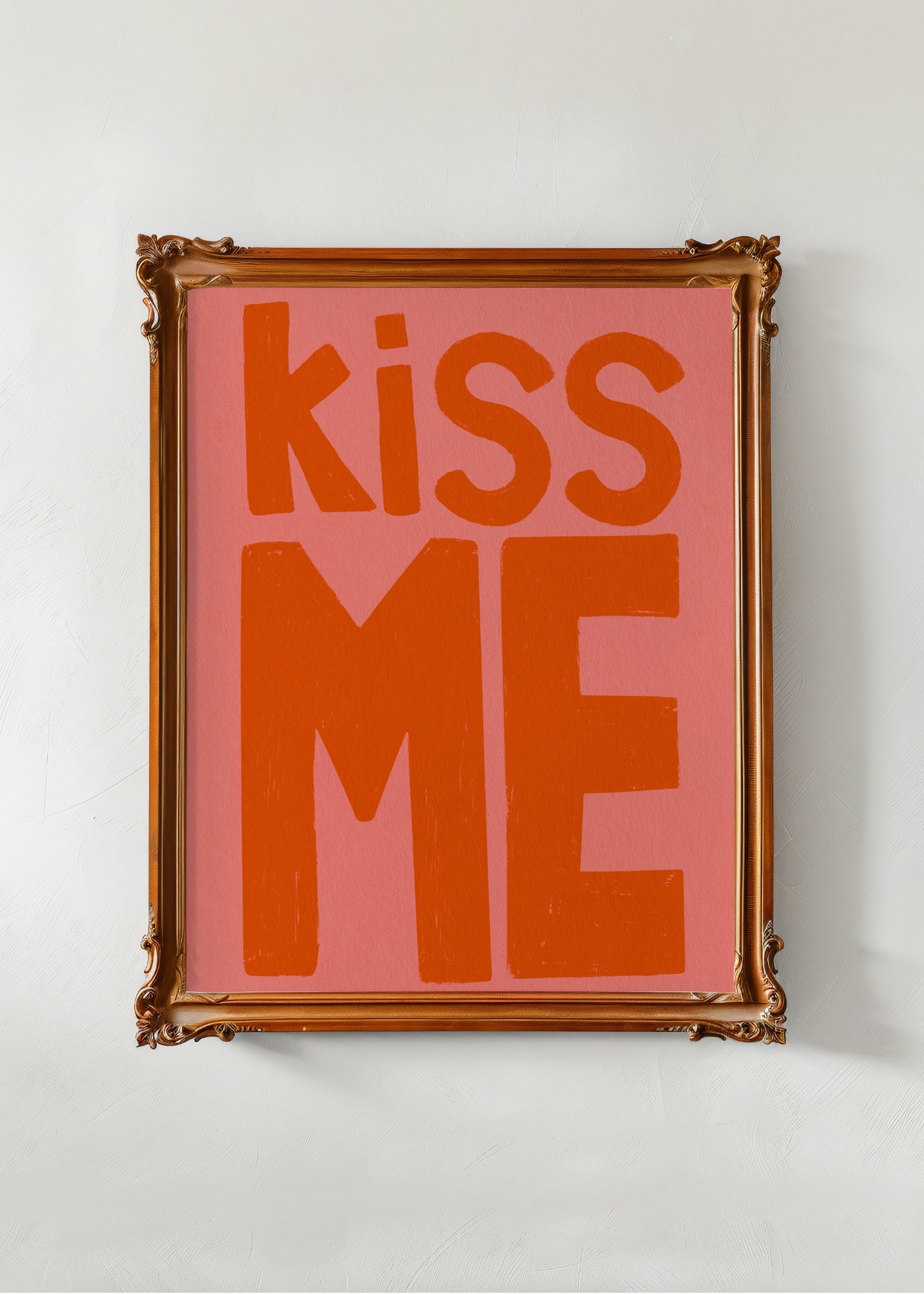 Kiss Me— Large hand-drawn block letters say it all: “Kiss me.” Bright orange-red letters jump off a sweet pink background in this bold, flirty piece. It’s playful, confident, and sugar sweet—in the very best way.