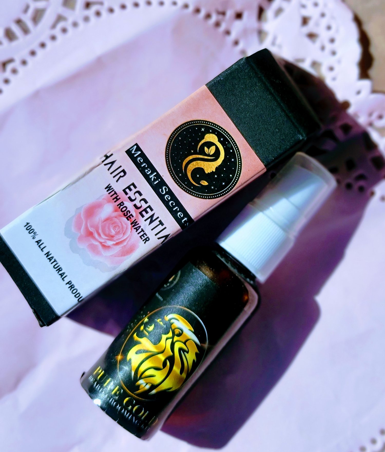 This kit is the ultimate hair and scalp rejuvenation will stimulate hair growth promoting thicker stronger, hair each product in this kit aids in, breakage, dry or itchy scalp, brittle hair and packed with antioxidants anti -inflammatory and has antiseptic properties to aid with all hair issues Hair essential with rosewater will stabilize your hair's ph. balance while at the same time repairing and restoring damaged hair. Meraki secrets signature Mango butter promotes rapid hair growth as it adds extra moisture that will prevent future breakage, Sealing it in oil finishing oil will improve the circulation of the blood in the scalp and strengthen your roots. Each product can be used in your hair and safe for your skin 100% All Natural Ingredients safe for all hair/ skin types,