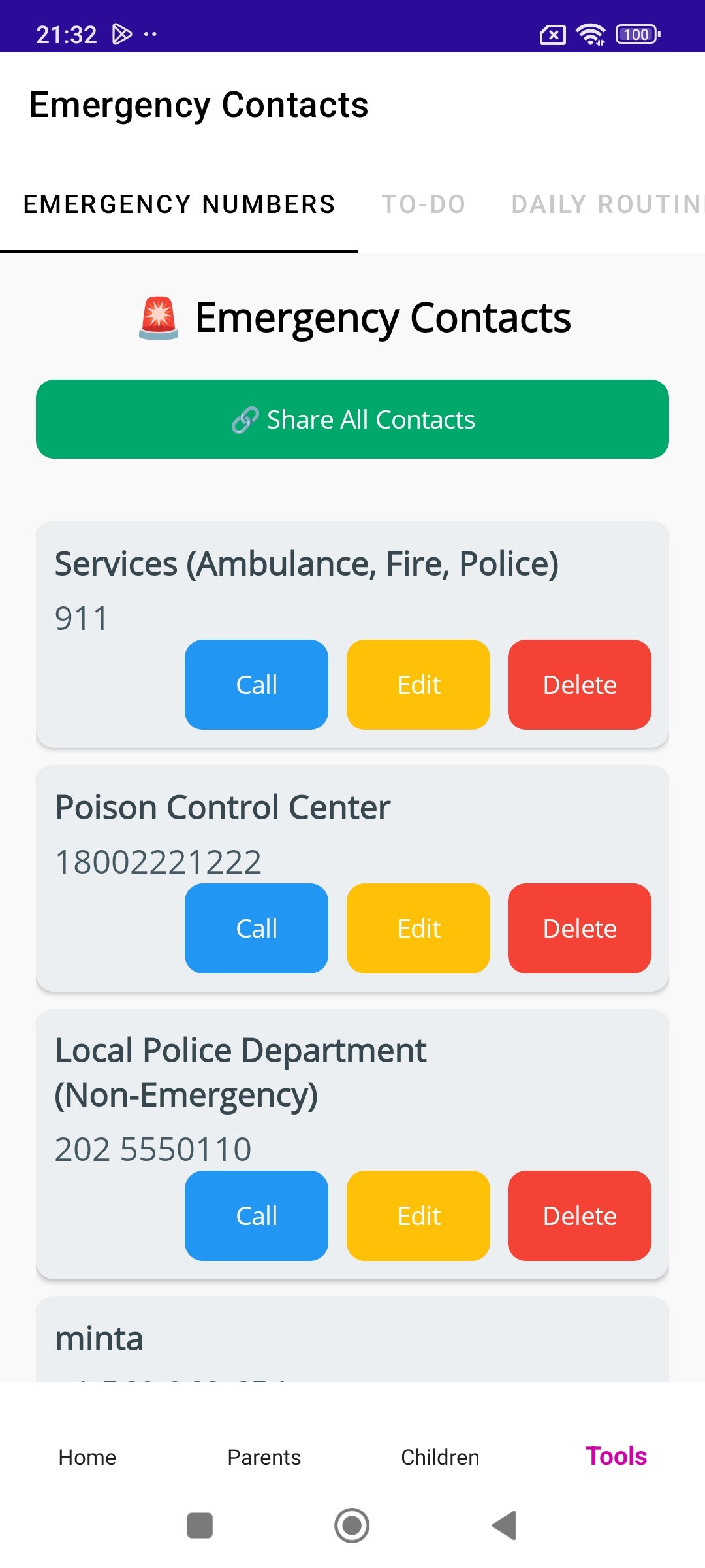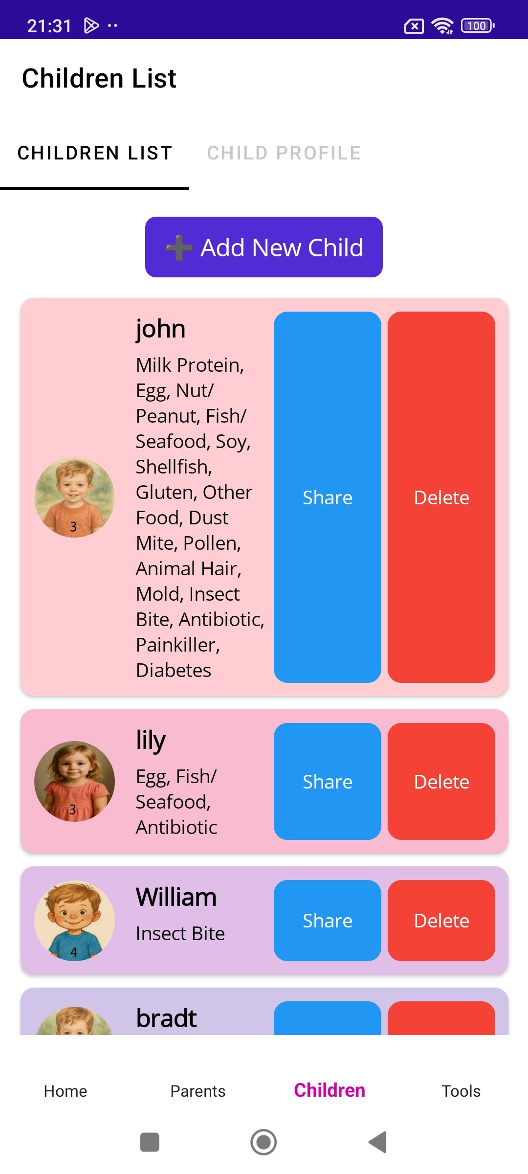 👶 Kids’ Profiles – Save important info about the children: age, allergies, medical info, and who to call in emergencies.