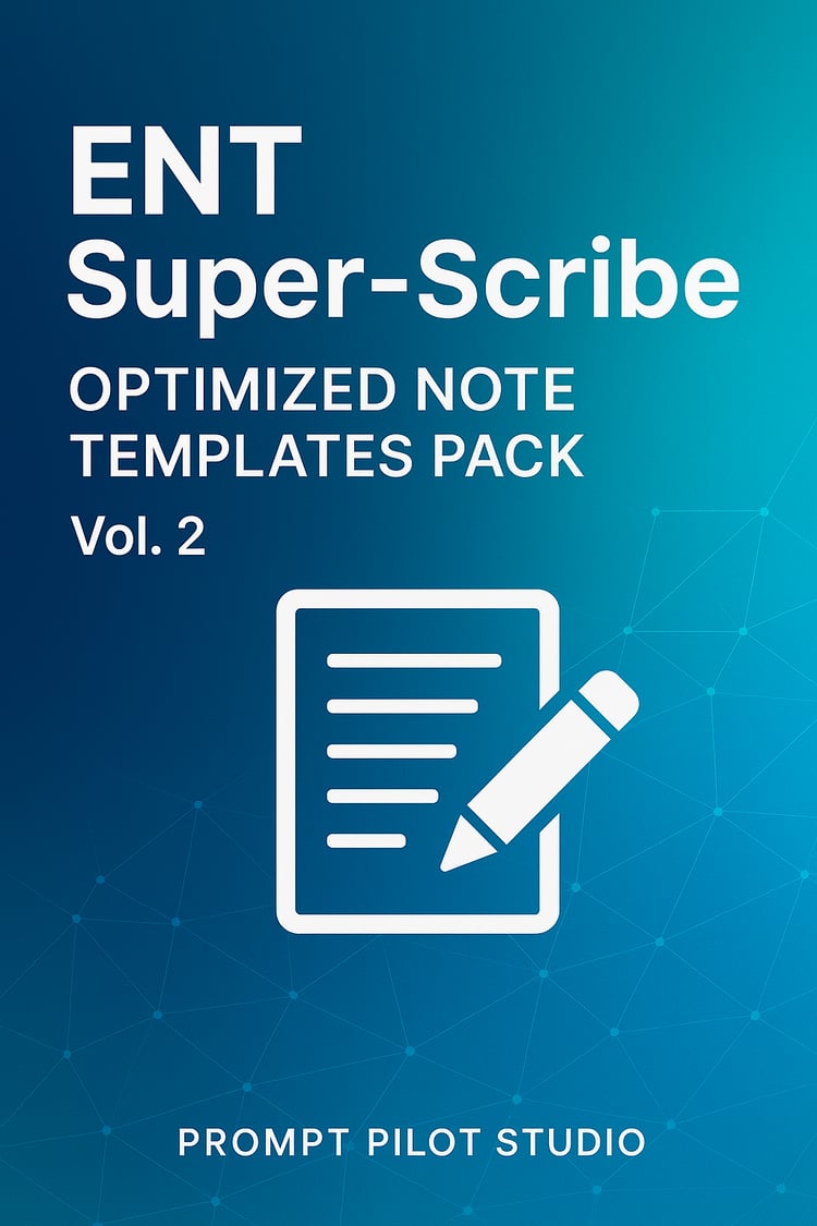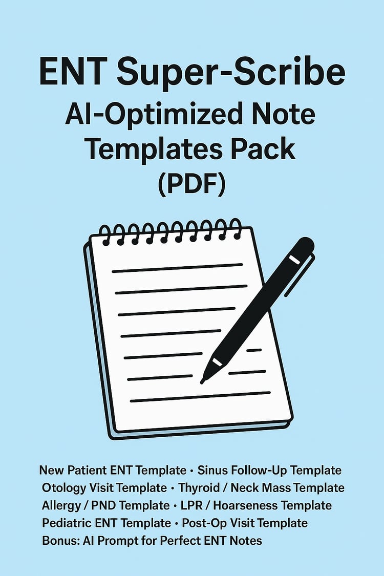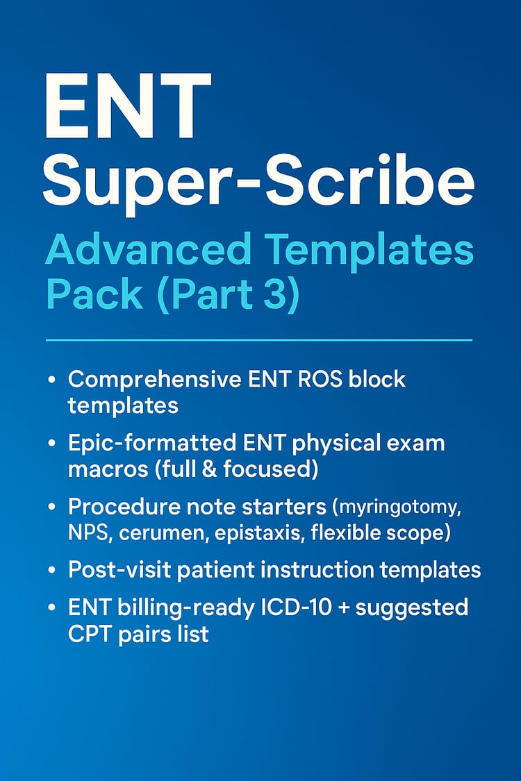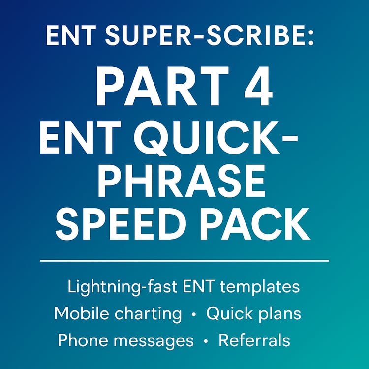 The ENT Superscribe Mega Pack brings all of your essential ENT templates together in one complete, easy-to-use bundle. It includes streamlined HPI guides, focused exam templates, and ready-made assessment/plan options designed to help you chart faster and with consistent, professional-quality detail. Perfect for busy ENT clinic days, telehealth visits, and building a high -efficiency documentation workflow.