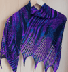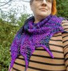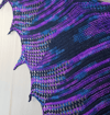I have taken the “evil” side of things and brought them into the shawl with the pointy lace and angular shawl shape. The yarn, a collaboration with Tami of Eternity Ranch Knits, was dyed specifically for the project and shows a wonderful darkness and complexity. On the fairy side, I’ve tried to keep things drapey and light, hence the larger needle size. The yarn ties in here well too, because we do tend to think of fairies as beautiful (even the evil ones) and the yarn is not only beautiful in its colours, but also the inclusion of Tencel in the base adds a gentle shine and contributes to the shawl’s drape and beauty.