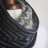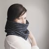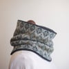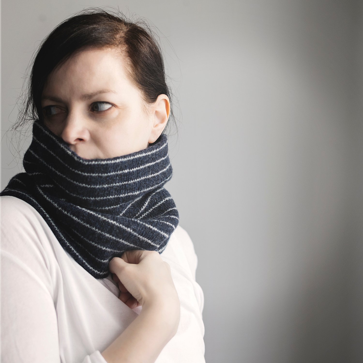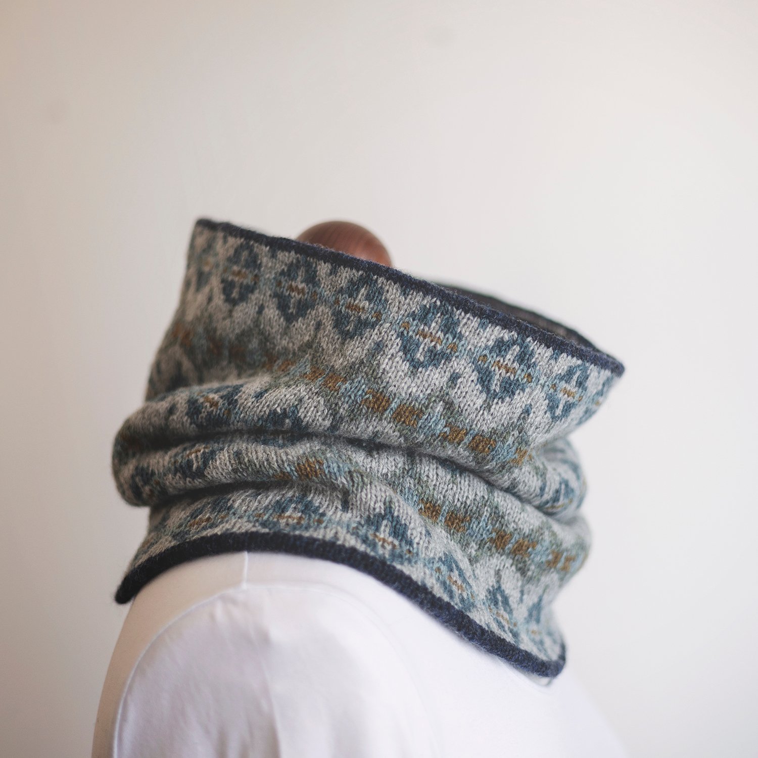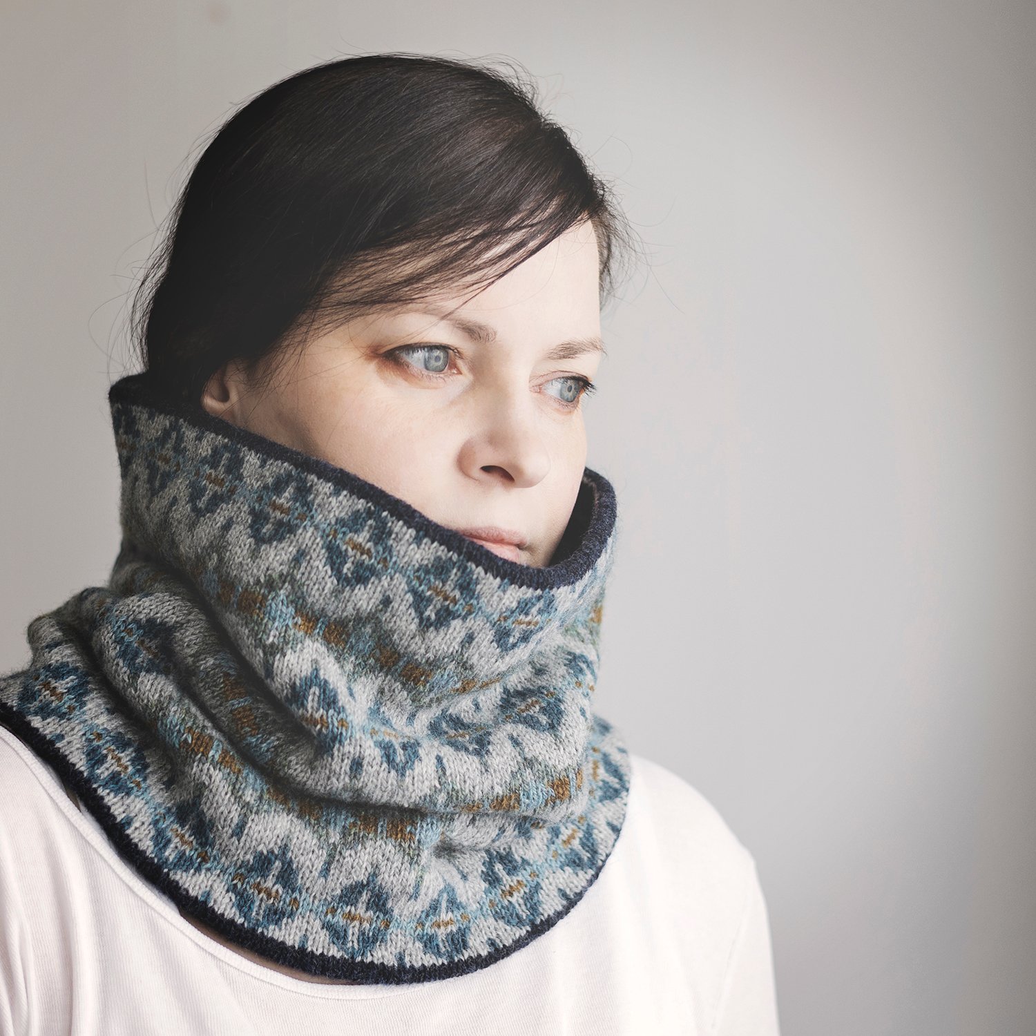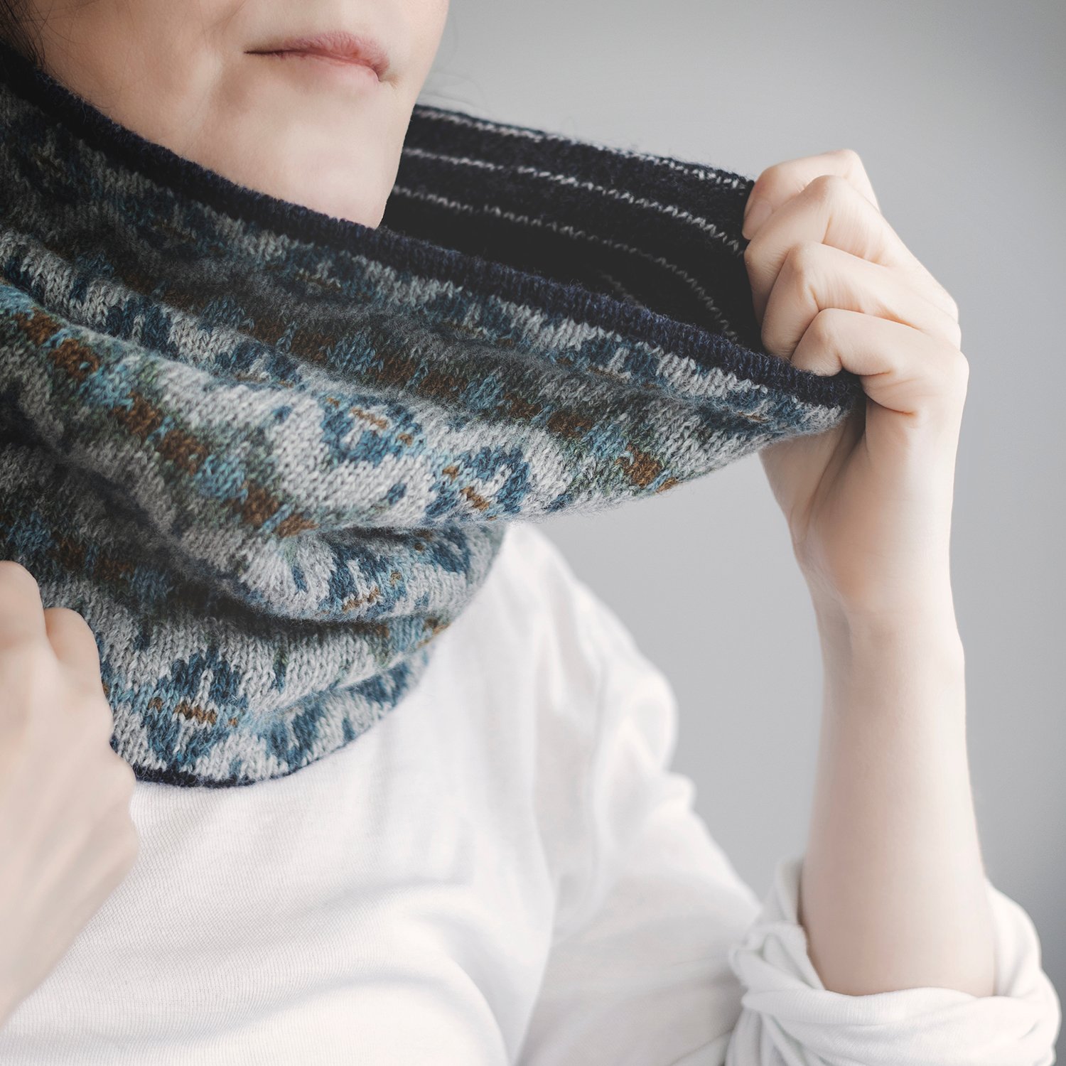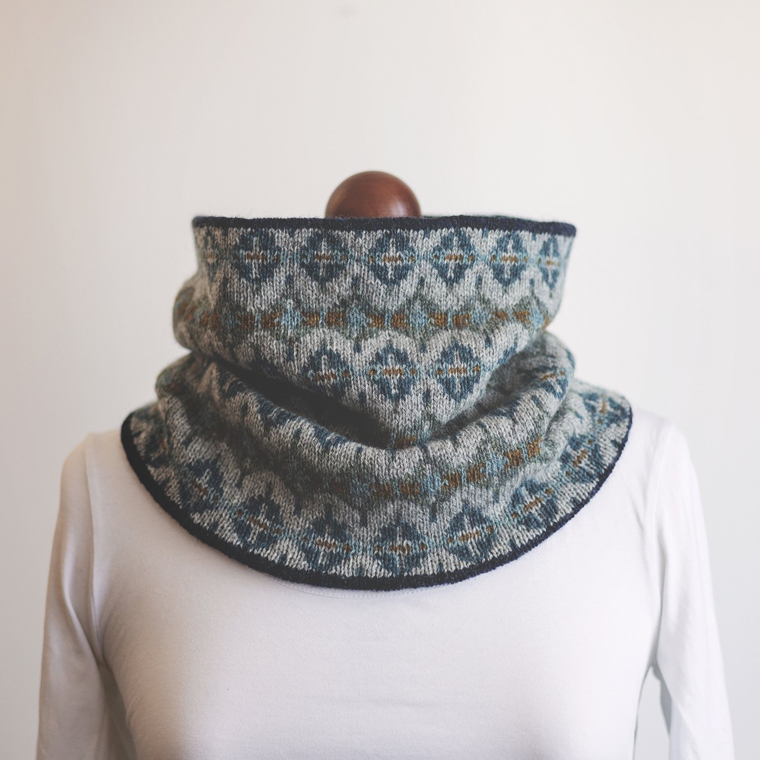 The Old Compass cowl is worked as a long tube in the round in two different patterns. The striped section is worked slightly longer than the other section to provide a slim color frame at the top and the bottom for the colorwork side. The cowl is slightly funnel shaped, which is achieved by changing the size of your needles through different sections.