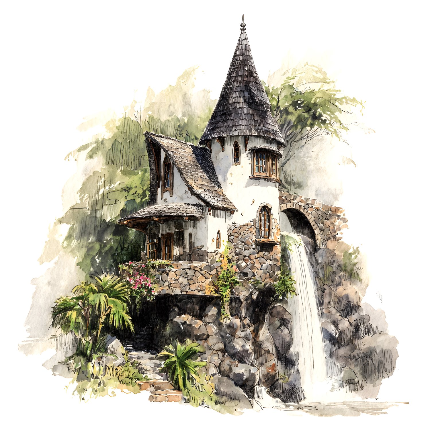 Waterfall Peculiar Towers – 18 Whimsical Fantasy Architecture Art Prints