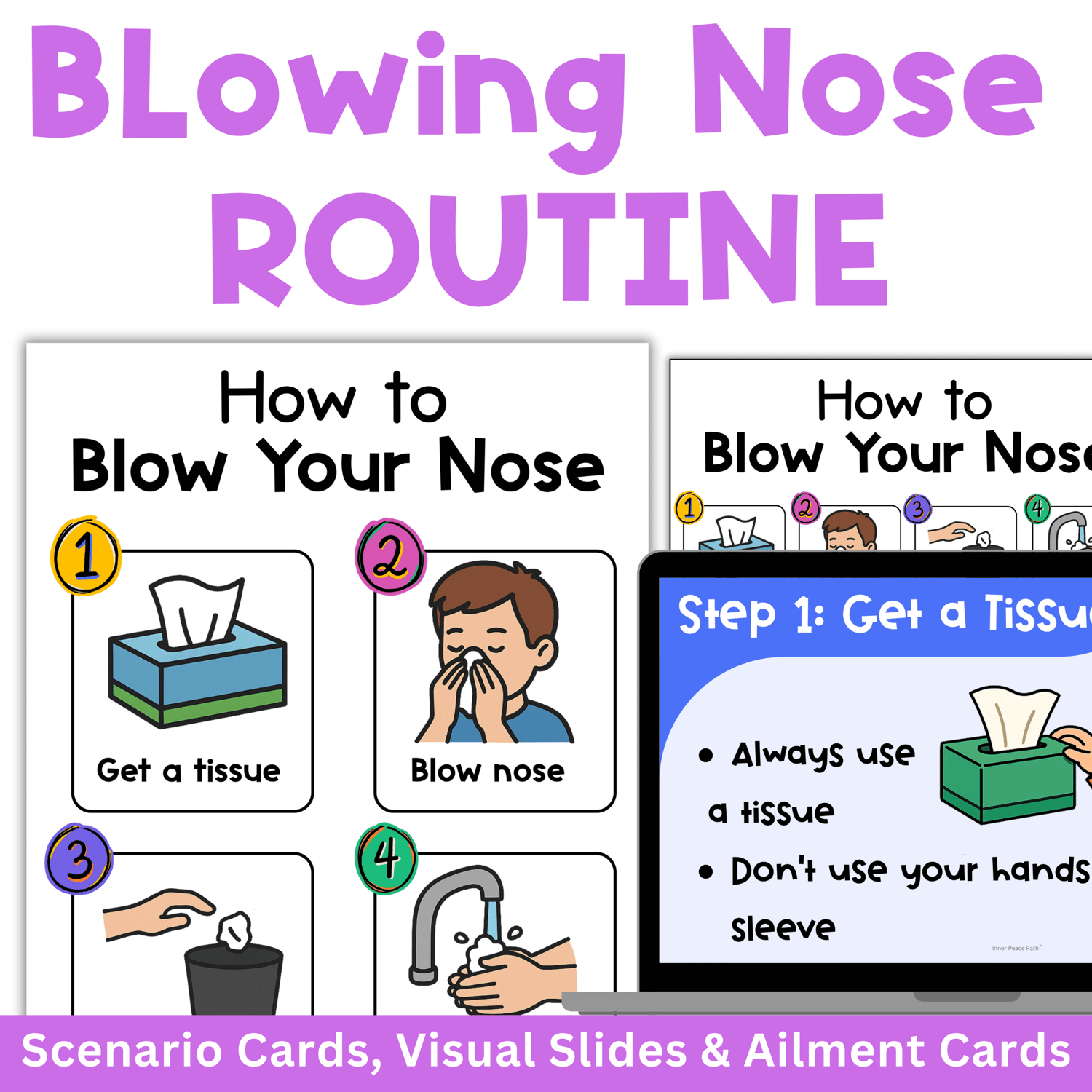 Blowing Nose Routine posters and teaching slides make it easy to teach children healthy hygiene habits in a clear, visual way. Perfect for classrooms, therapy rooms, and home use, this resource shows each step of the routine in student-friendly language and engaging visuals.