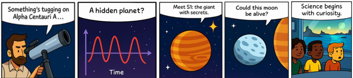 Explore the four-part October Blog Series—a narrative journey through the detection of S1, a gas giant orbiting Alpha Centauri A, and the moons that might harbor life. Each chapter invites readers to imagine, question, and connect with the science behind the search.