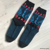 Method: These stranded colorwork socks are knit in the round from the cuff down with a round heel and gusset decreases placed on the sole.