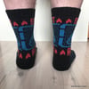 Yarn: You can use any 4 ply (fingering) sock yarn that you like and with which you can get gauge to knit these socks. I have used three colors, black (MC), red (CC1), and blue (CC2) but you could use just one contrast color or use a whole bunch! Be creative, have fun, but keep in mind changes will affect yardage and number of ends to weave in. Please note I do not recommend using yarns with a high cotton content as cotton doesn’t stretch as much as other fibers and this will affect the fit of your socks.