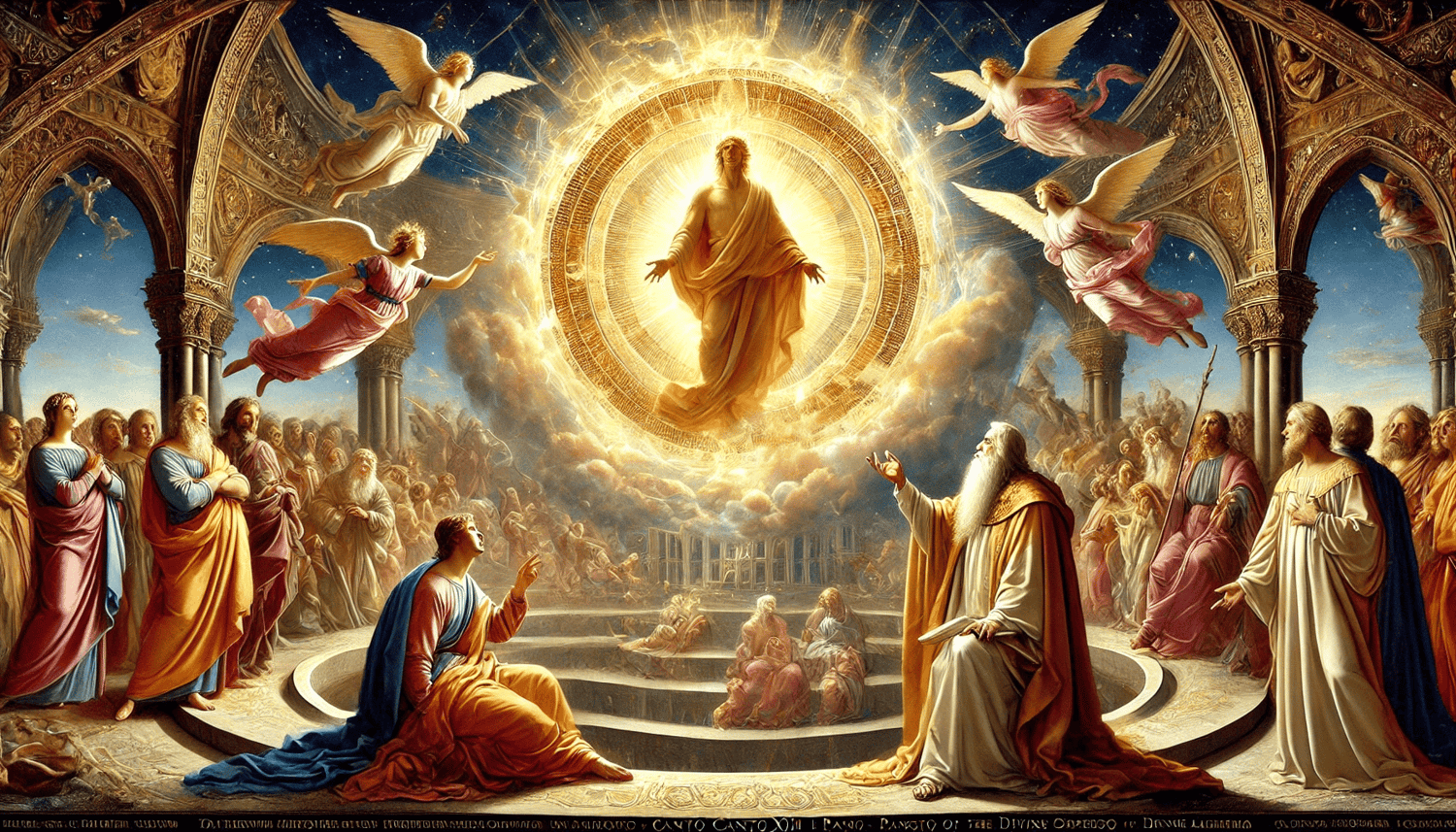 In the celestial sphere of the Sun, where the wise souls dwell, Dante witnesses a divine vision of Solomon, the biblical king renowned for his unparalleled wisdom. Encircled by radiant golden light, he stands as the embodiment of divine knowledge, his presence illuminating the grand assembly of philosophers, saints, and scholars who revere his insight. Angels ascend toward the celestial radiance, their ethereal forms symbolizing the eternal transmission of wisdom. This breathtaking scene captures the harmony of enlightenment, faith, and divine justice, echoing the core themes of Paradiso.