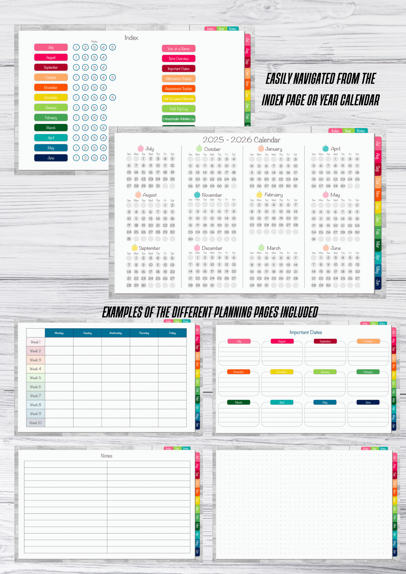 Stay organized this school year with a digital teacher planner! This 471-page PDF includes dated Sunday to Saturday monthly calendars for July 2025 to June 2026, dated Monday to Friday weekly planners with enough space for seven subjects or periods, and dated daily planners for every day of the week. Also included are extra pages to help with planning and record keeping, such as pages for notes (lined, graph, dot grid), book lists, attendance taking, assessment tracking, field trip and extracurricular activity logs, year at a glance and term planners, lesson and unit planners, and important date lists. Perfect for teachers and homeschoolers!