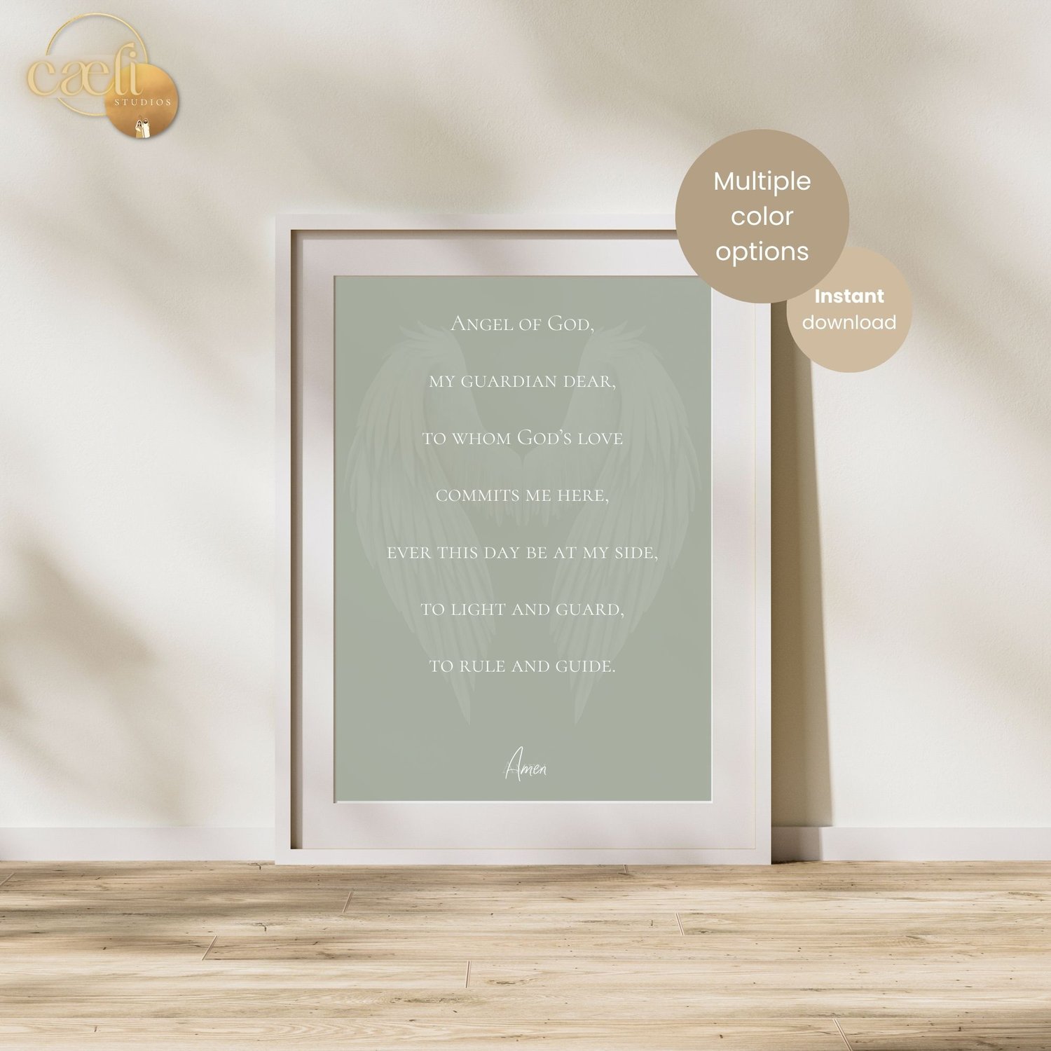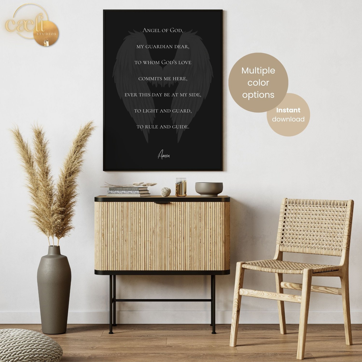 This digital download includes an "O Angel of God" prayer printable wall art design perfect for a modern, minimalist or bohemian Christian home with 5 different color options.