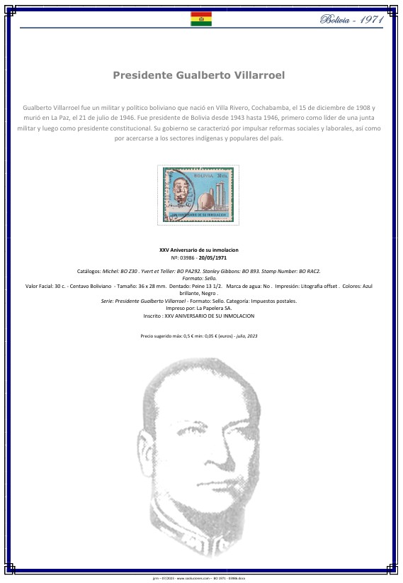 Bolivia 1971 – Gualberto Villarroel (Ficha de sellos descargable en PDF) - 03986