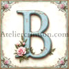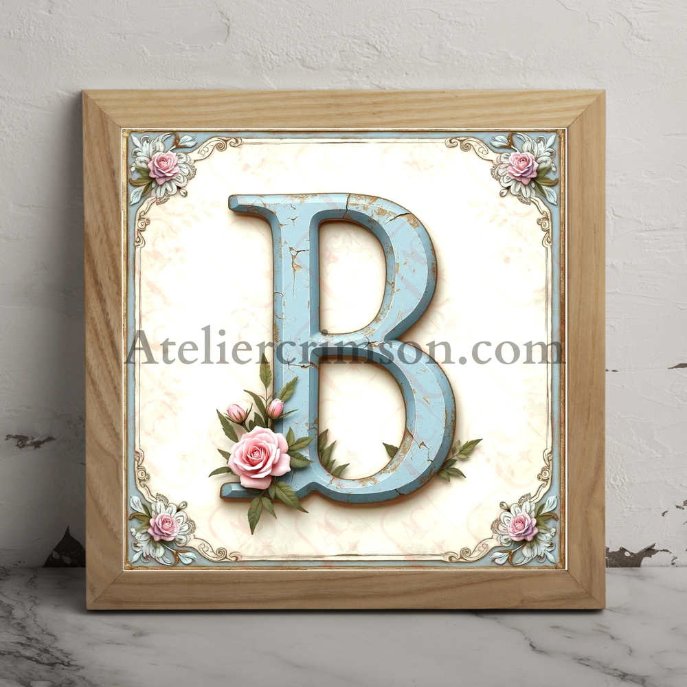 The letter B shabby chic blue a work of art in soft pastel blue. These elegant characters, reminiscent of weathered painted wood, stand out against a delicate off-white background with subtle floral accents. Perfect for vintage-inspired home decor, DIY projects, or creating unique, personalized gifts with a touch of timeless elegance.