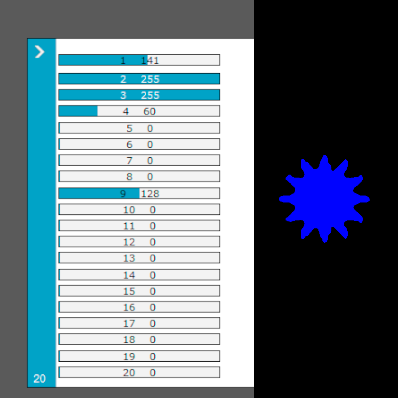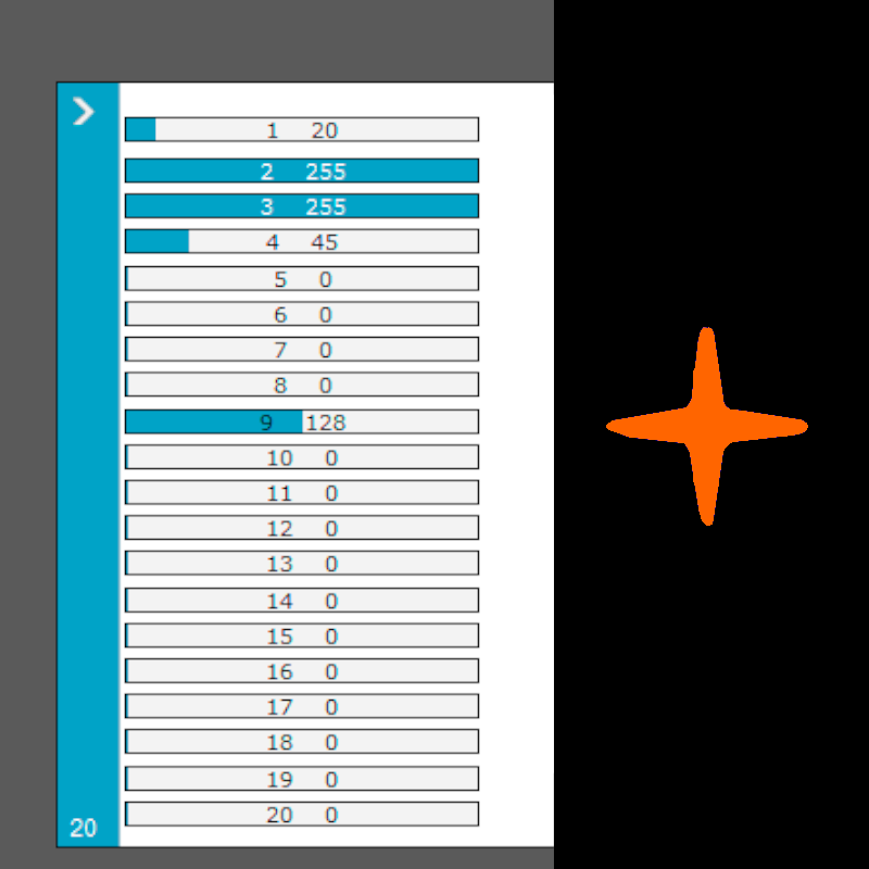 * Verifique, con un Fixture de pruebas (click), que coincidan estos canales: 3 Dimmer, 2 Strobo / Shutter, 1 en el valor 20 = Color Naranja, 1 en el valor 141 = Color Azul, 4 en el valor 45 = Gobo de Cruz, 4 en el valor 60 = Gobo de Sol, 9 foco (ver fotos 3 y 4).