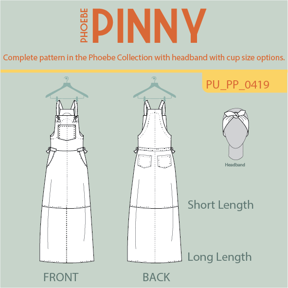 Pinny version of the Phoebe Bib & Tucker. Features centre front and back seams, bib pocket, front pockets and back pockets. Strap and ties can fasten by being knotted or adapted.