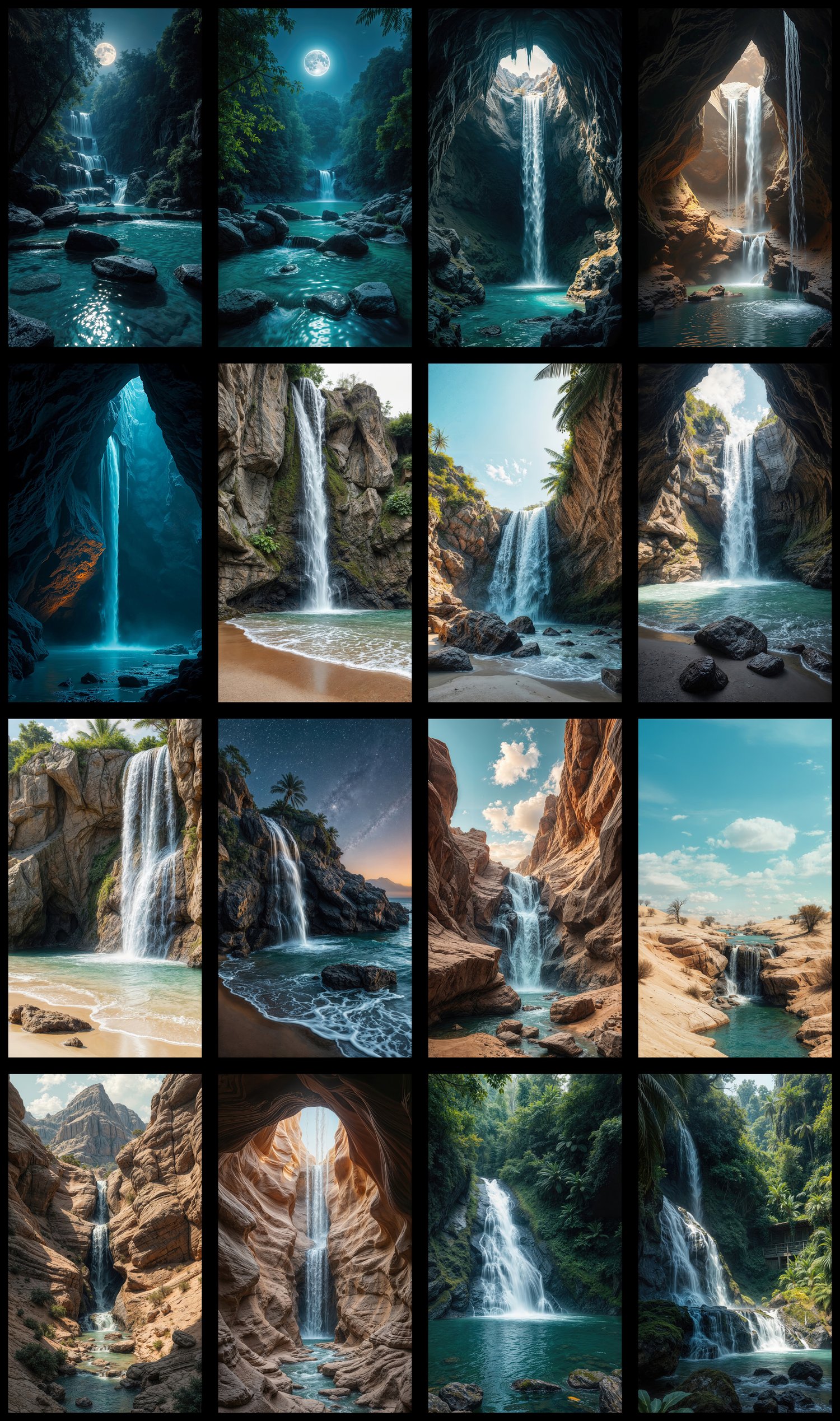 Marvel at the cascading majesty of waterfalls in our Vertical Panoramas collection! This bundle includes 44 high-resolution artworks (4000px, 300 DPI) perfect for album covers, book covers, YouTube thumbnails, social media graphics, and print projects.