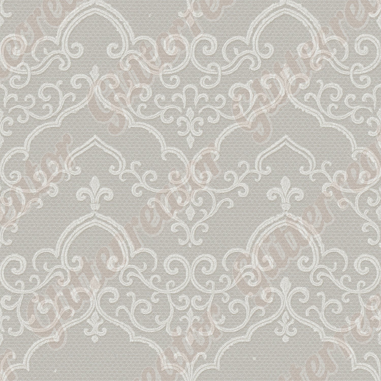 Soft white lace, geometric mandala rosettes, subtle shimmer