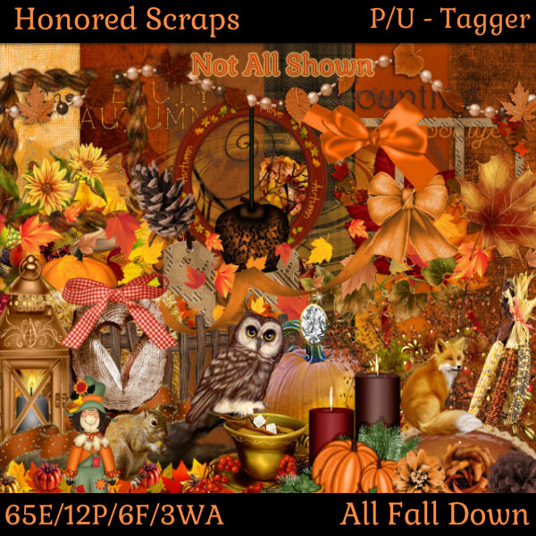 All Fall Down is a tagger kit that consists of 65 elements, 12 papers, 6 frames and 3 word art.